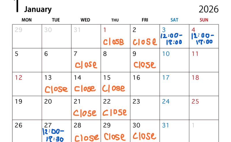 <1月の営業について> 1月は18時にCLOSEいたします。水曜日以外の休業日はカレンダーでご確認をお願いいたします。 OPEN→12:00-18:00 (1/27は17:30にCLOSEします)CLOSE→ 1,… 続きを読む “1月のお知らせ”