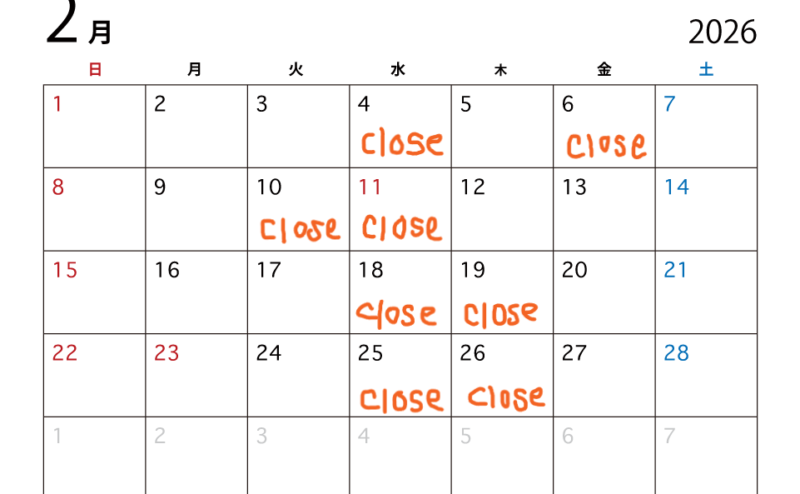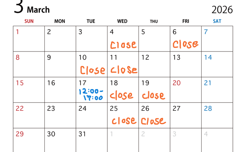 <2月の営業についてのお知らせです> 誠に勝手ながら、2月も引き続きCLOSE時間を18時に変更して営業いたします。営業日/休業日は下記の通りです。(営業日時を変更する際はインスタグラム,HPで都度お知らせします)ご確認… 続きを読む “2月のお知らせ”