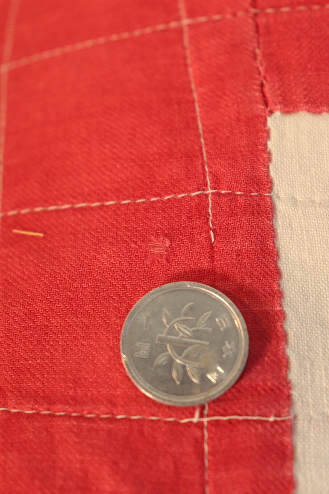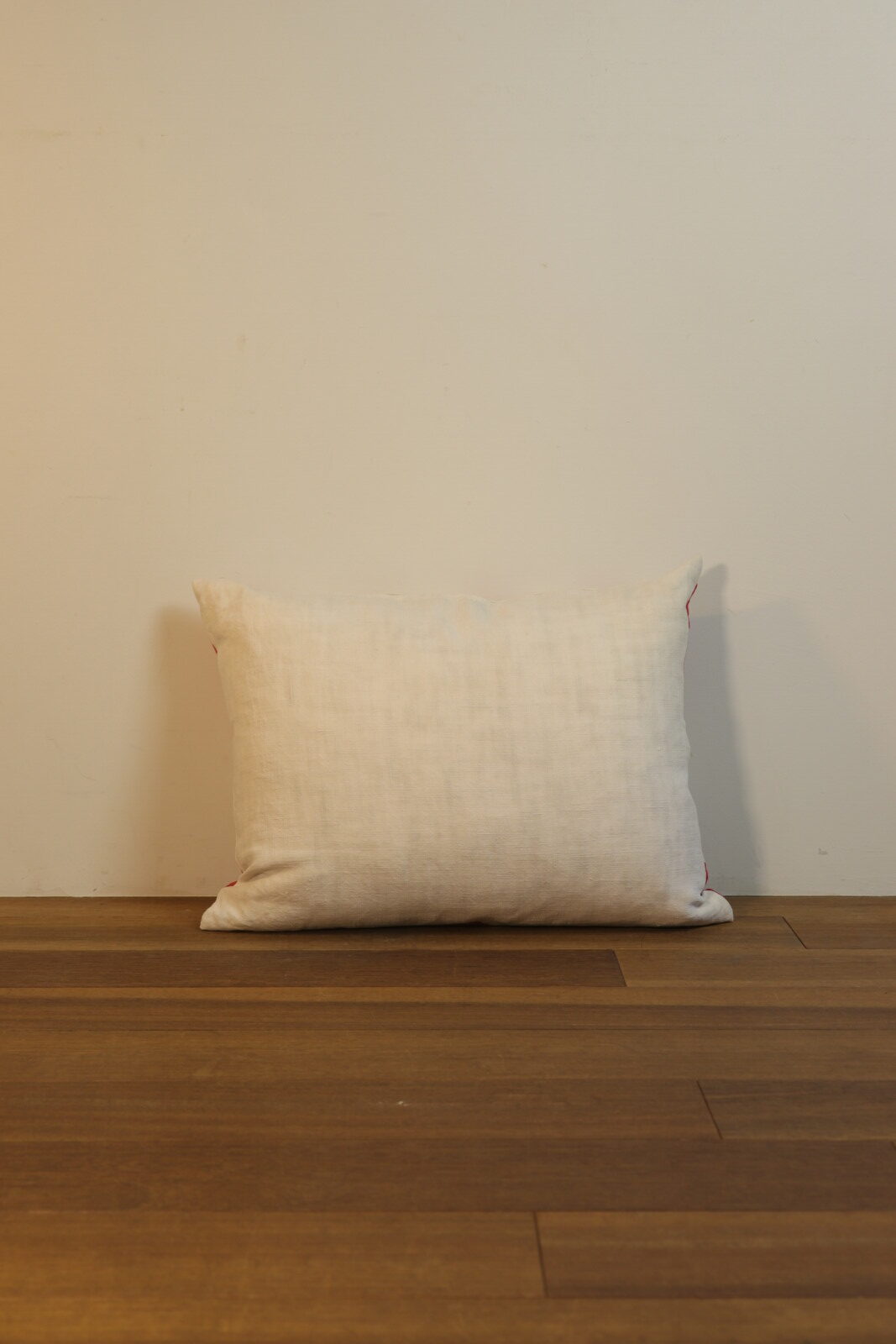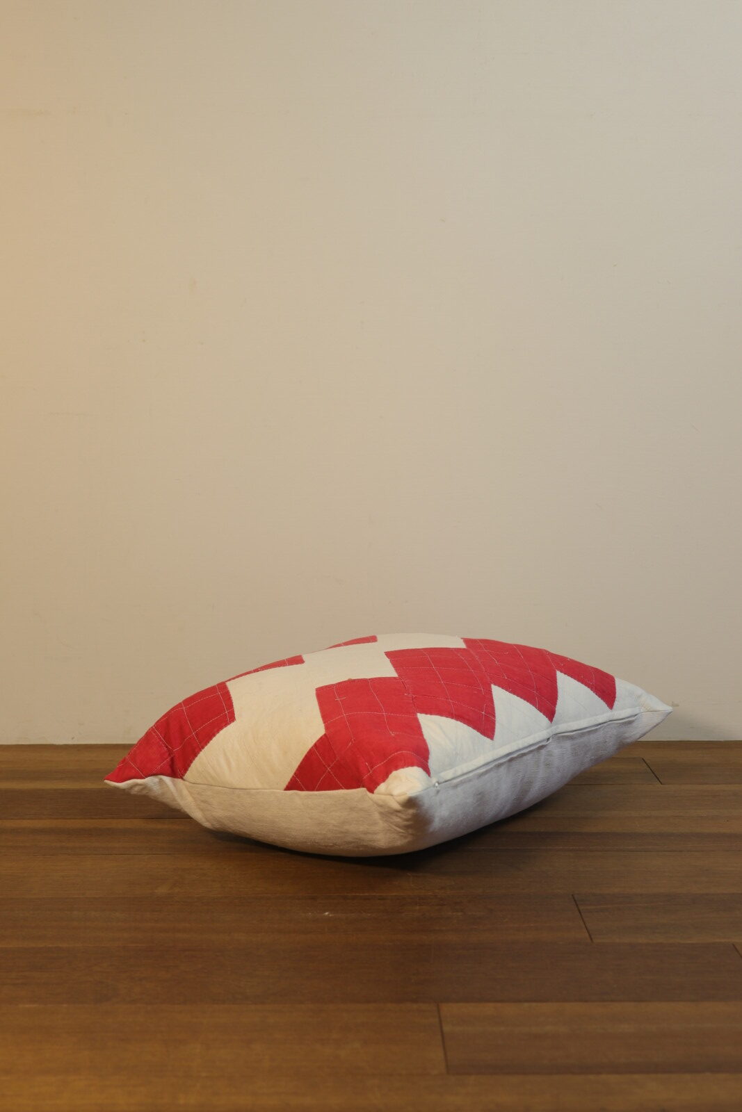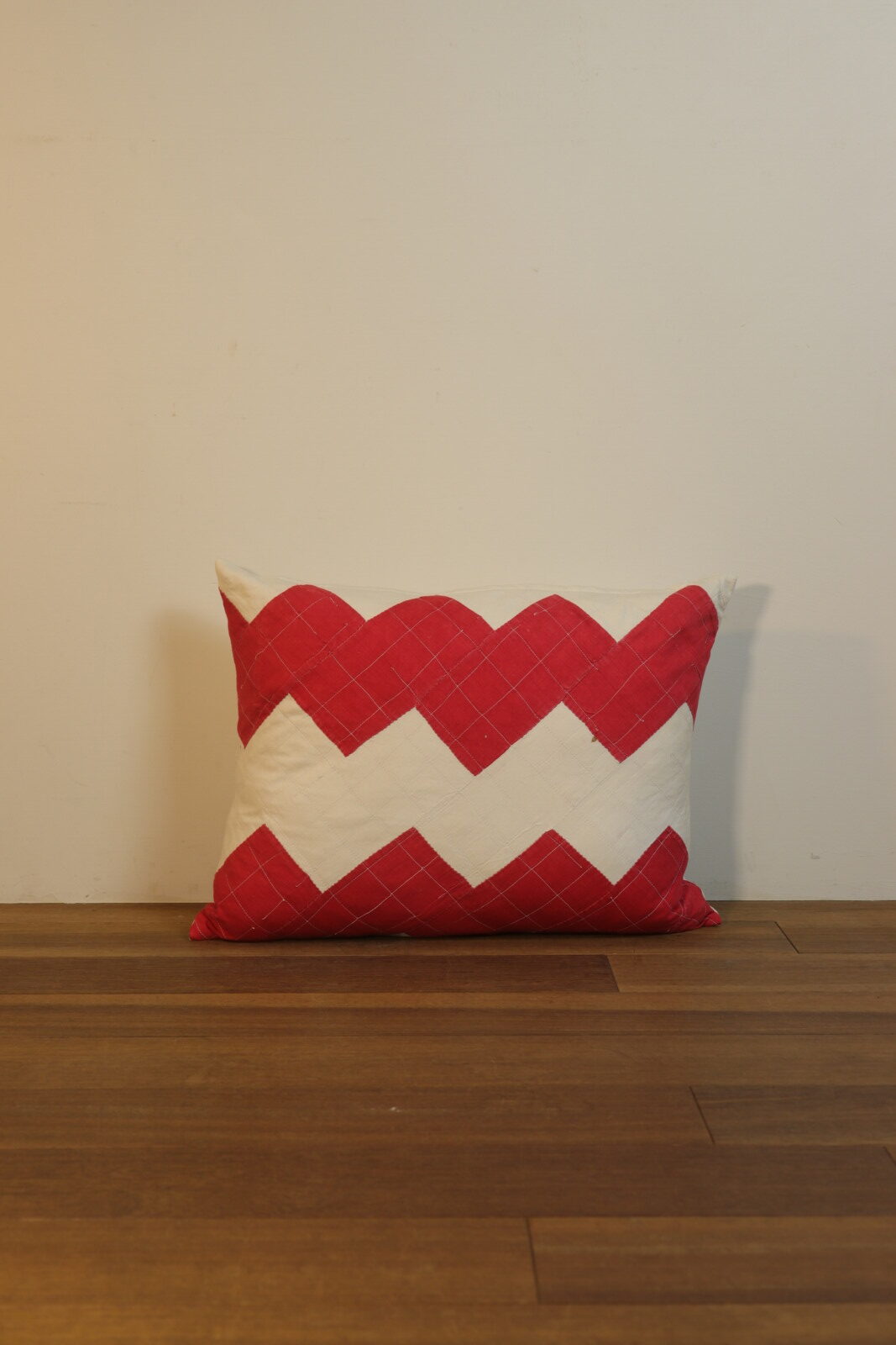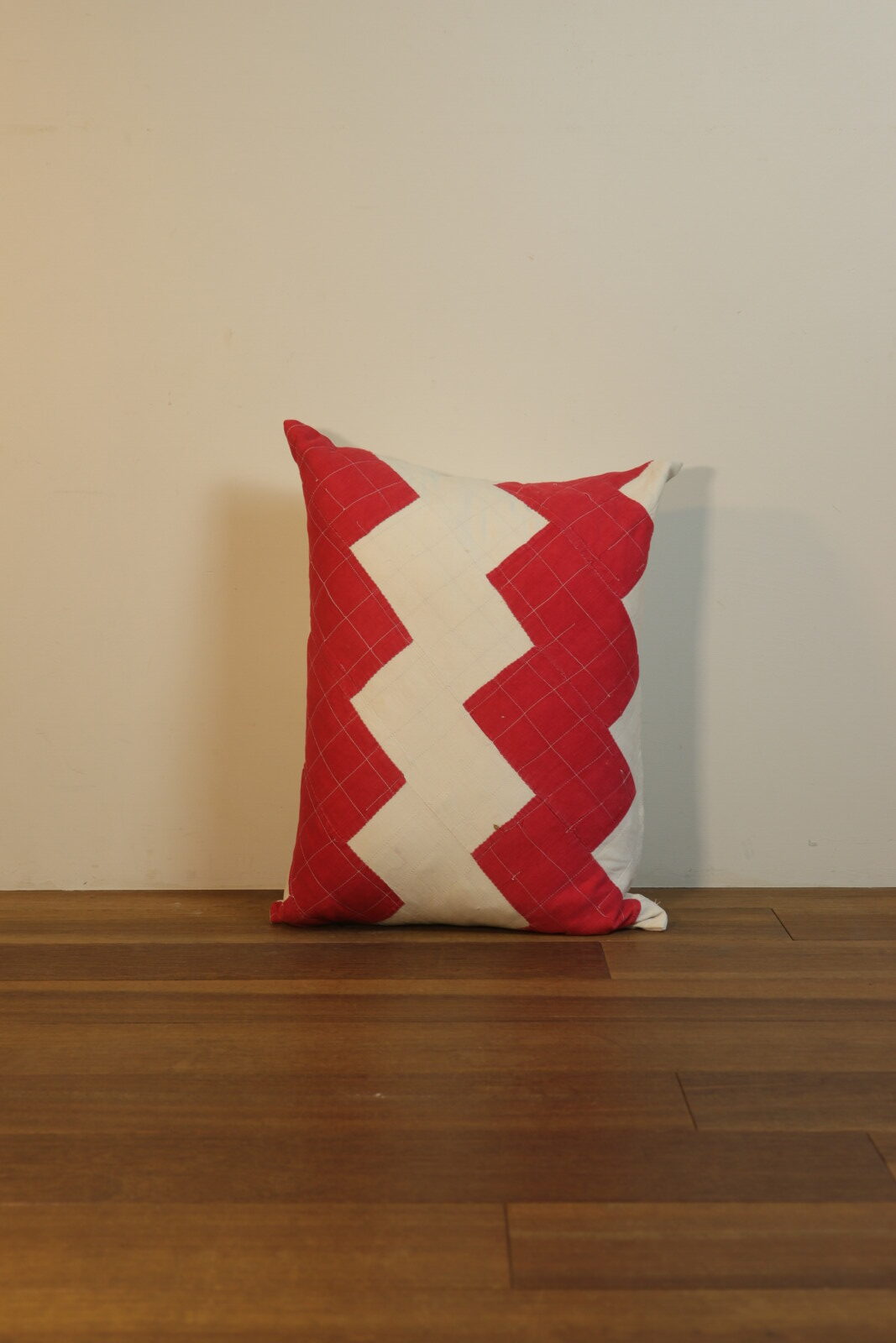 1900~1920年代にアイルランドのお家で使われていたキルトトップをクッションにリメイクしました。裏側には古いフレンチリネンを使っています。アイルランドのキルトはとても希少価値がありコレクターズアイテムとなっています。このキルトはジグザグ模様をハンドで仕上げた上にミシン掛けしてあります(ミシン掛けは補強のために後で施されたのかもしれません)。褪せた赤色が素晴らしい。ベビーキルトを4分割したので小さくなっていますが存在感は十分あります。今後ほつれたりしたところを違う生地を当てて補修していくのも楽しいと思います。