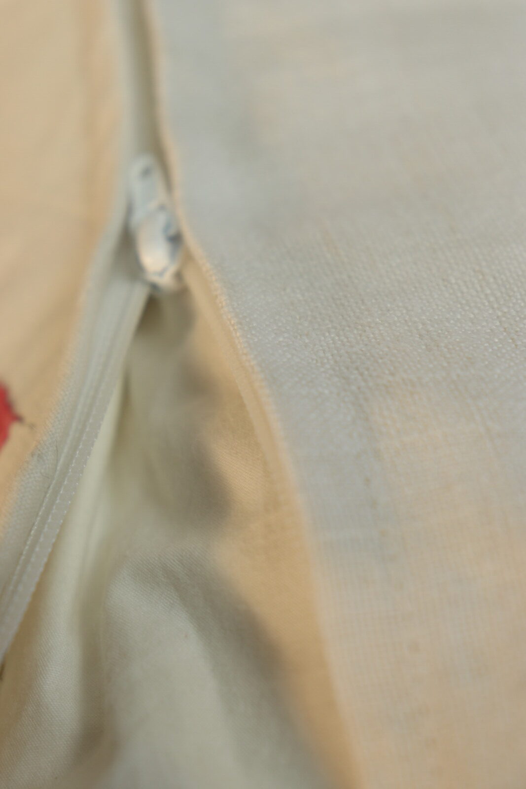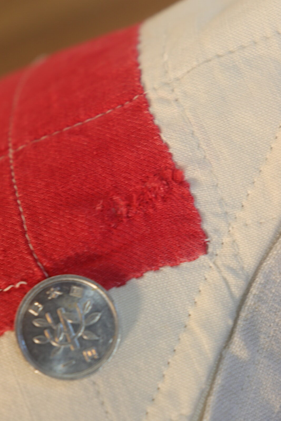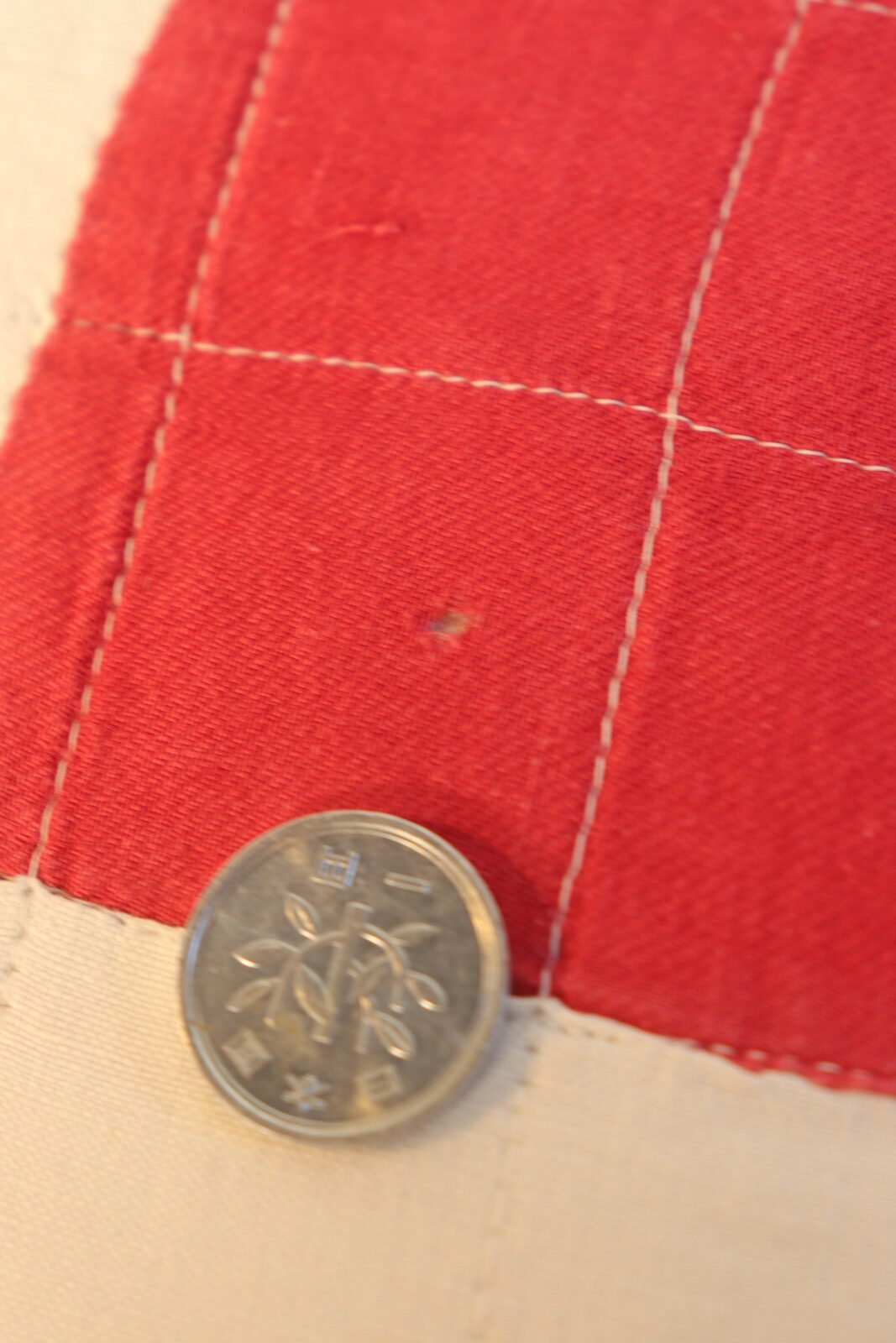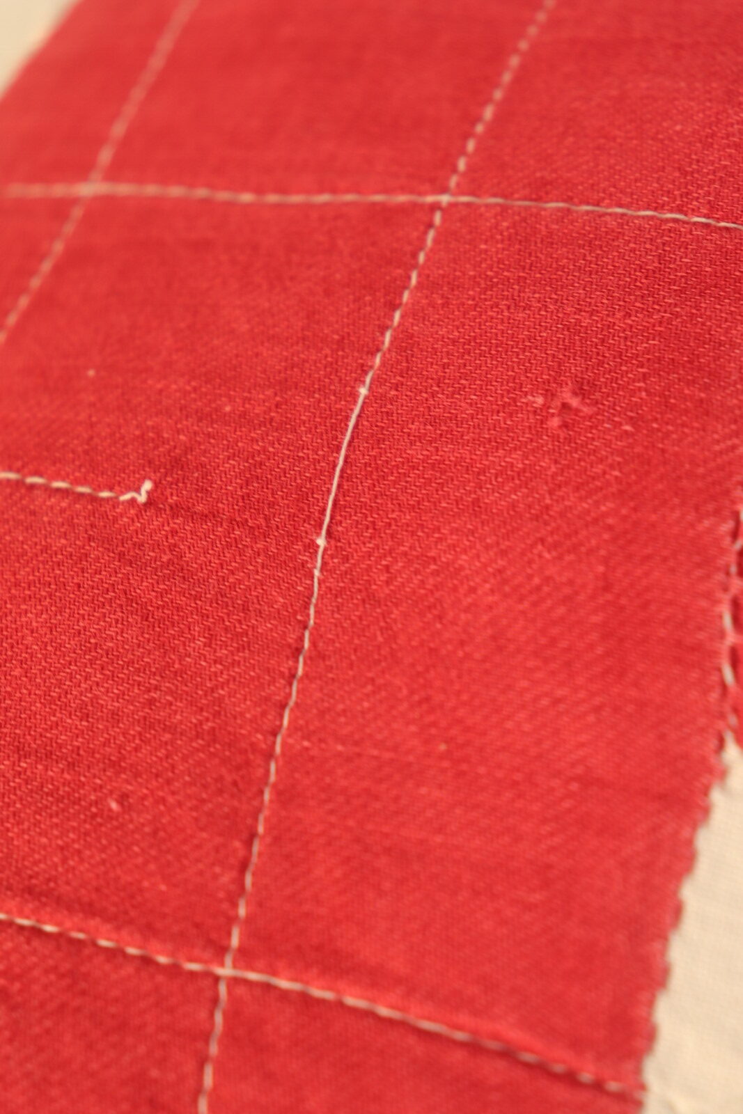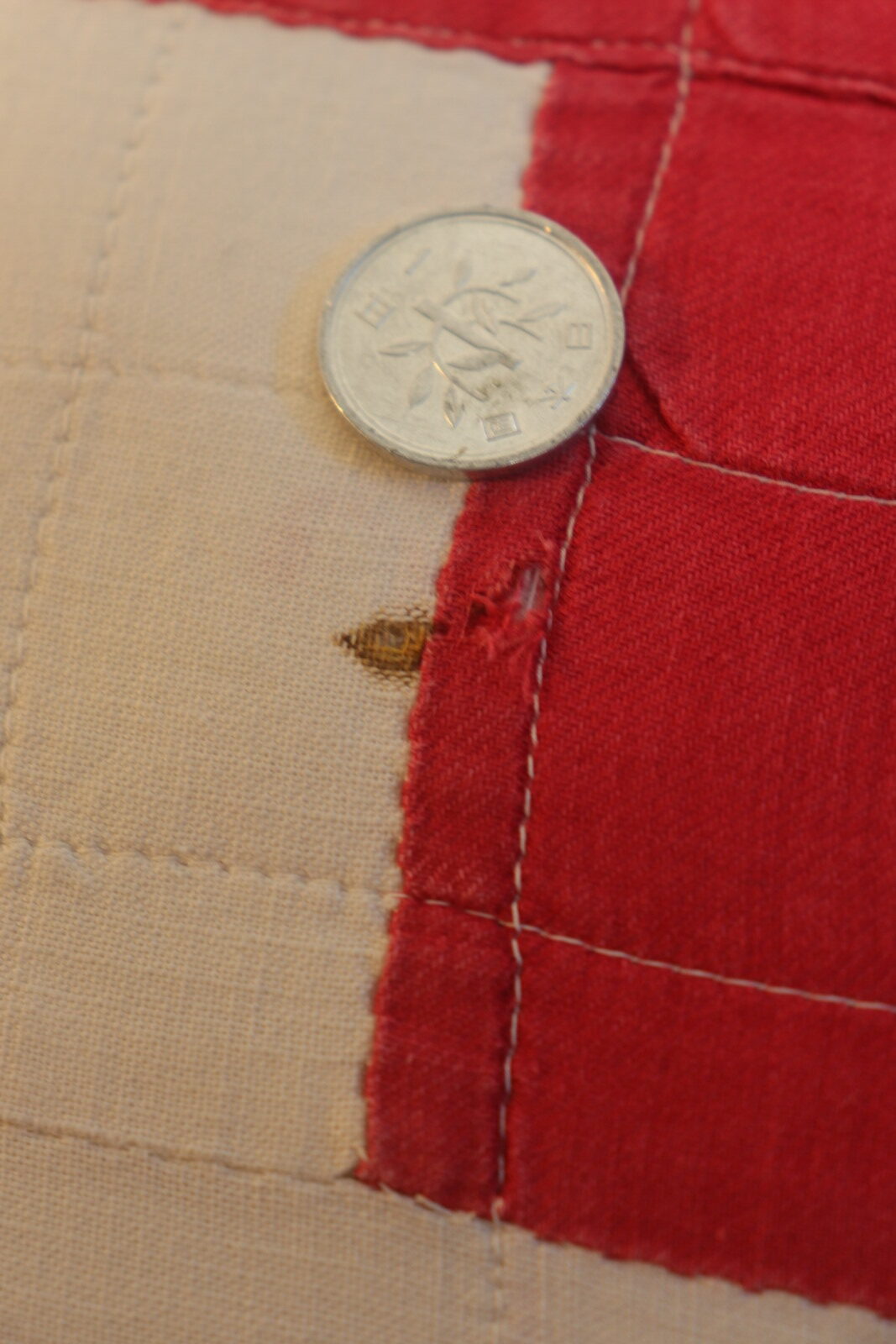 1900~1920年代にアイルランドのお家で使われていたキルトトップをクッションにリメイクしました。裏側には古いフレンチリネンを使っています。アイルランドのキルトはとても希少価値がありコレクターズアイテムとなっています。このキルトはジグザグ模様をハンドで仕上げた上にミシン掛けしてあります(ミシン掛けは補強のために後で施されたのかもしれません)。褪せた赤色が素晴らしい。ベビーキルトを4分割したので小さくなっていますが存在感は十分あります。今後ほつれたりしたところを違う生地を当てて補修していくのも楽しいと思います。