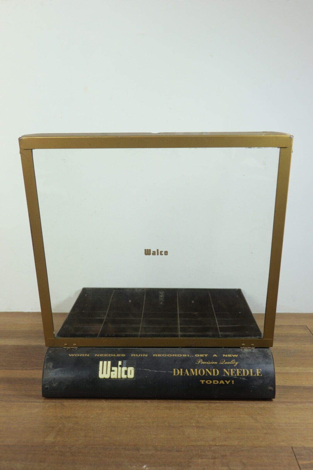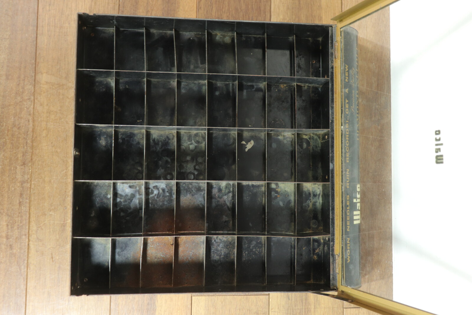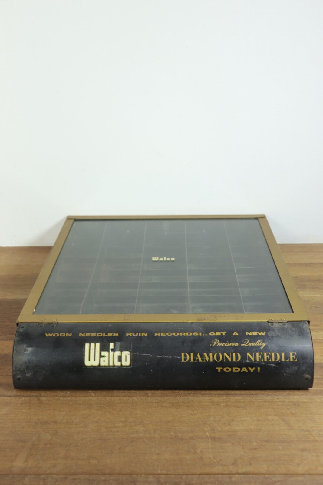 1940~50年代の”Walco”社のneedle(針)の入れ物です。仕切りがあり内容物がガラスで上から一目瞭然です。ガラスを開けてもカチッと止まってくれるので手で押さえる必要が無いのもありがたいです。また、置いた時のメタル部分の見た目がカッコ良いです。古いモノなのでガラスがピカピカではないことと仕切り一部にサビがあります(写真でご確認下さい。)