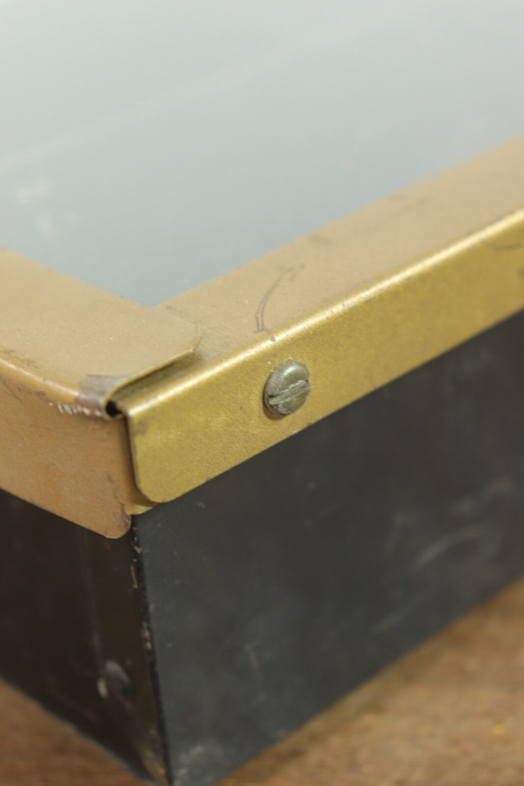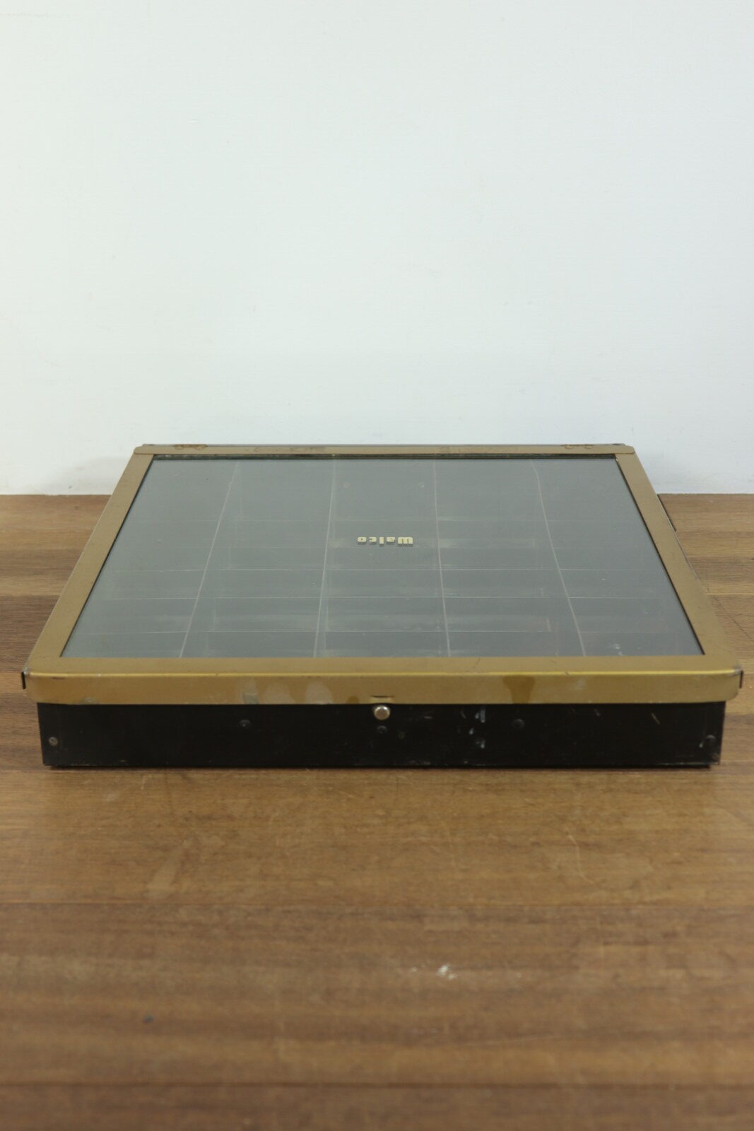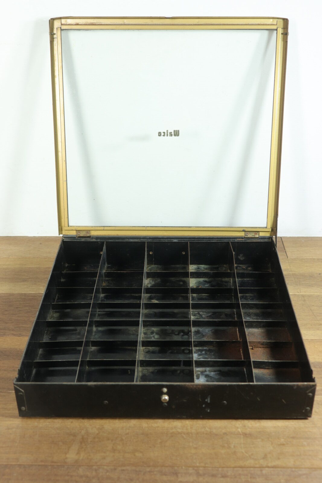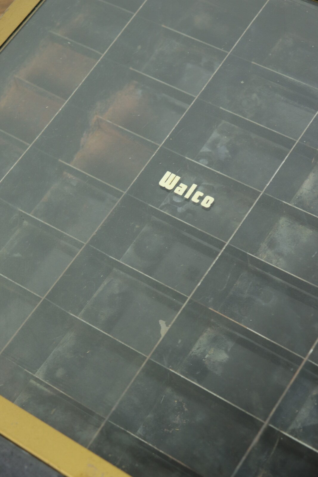 1940~50年代の”Walco”社のneedle(針)の入れ物です。仕切りがあり内容物がガラスで上から一目瞭然です。ガラスを開けてもカチッと止まってくれるので手で押さえる必要が無いのもありがたいです。また、置いた時のメタル部分の見た目がカッコ良いです。古いモノなのでガラスがピカピカではないことと仕切り一部にサビがあります(写真でご確認下さい。)