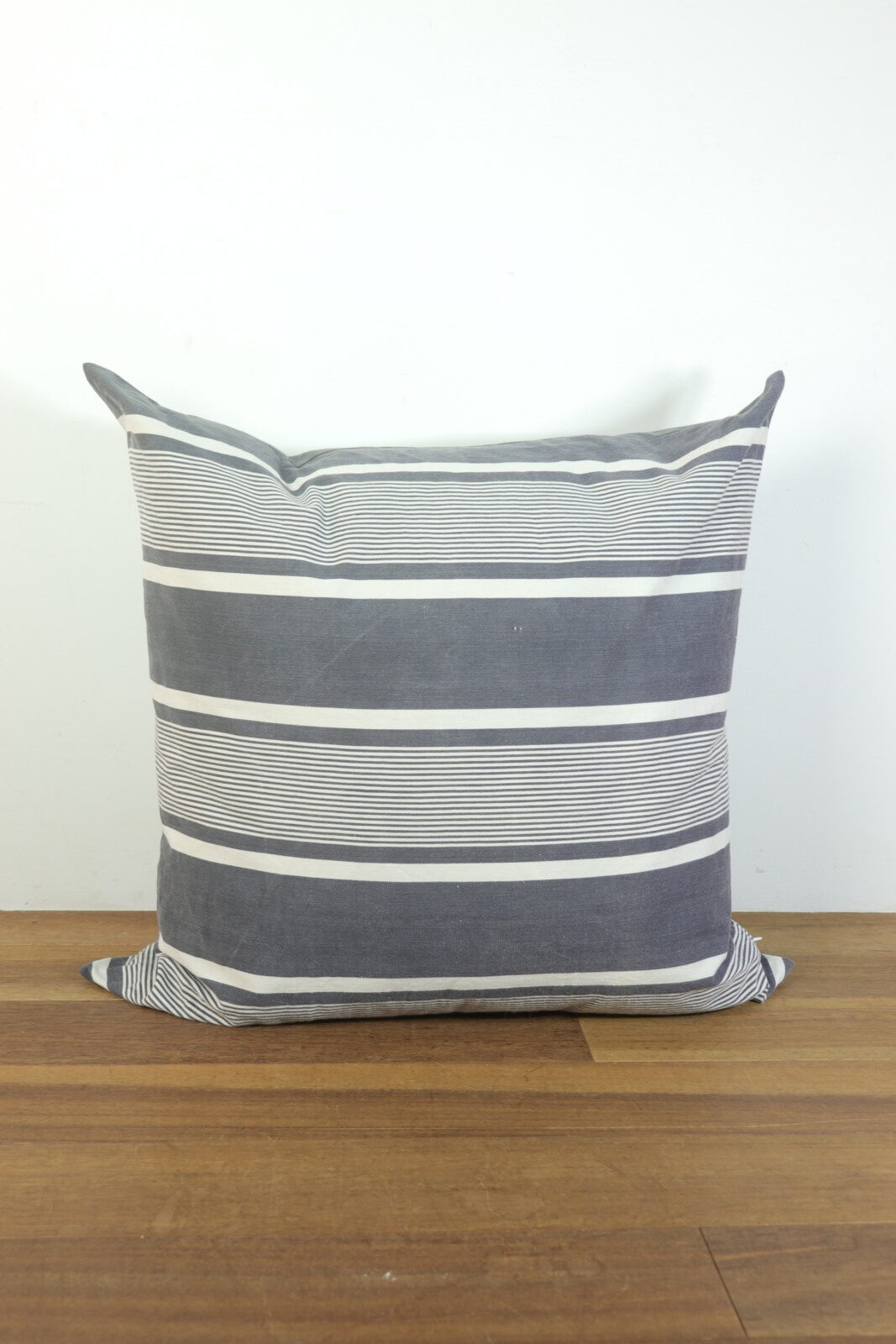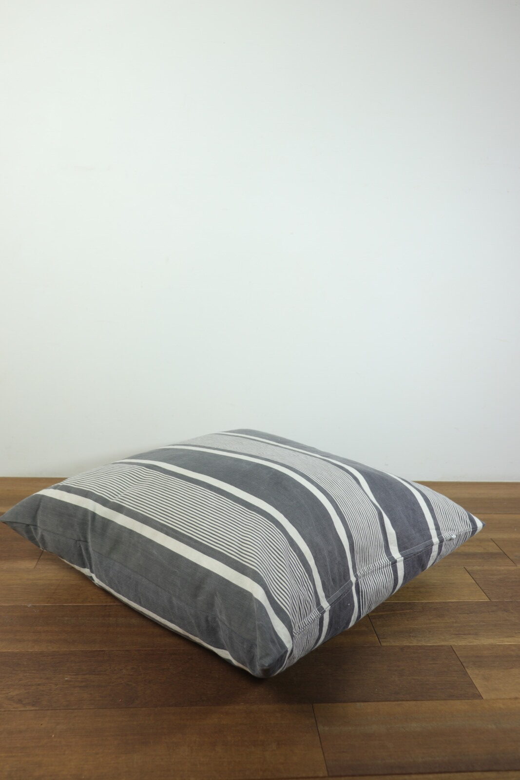 フランスの古いティッキング生地で作ったクッションです。インナークッションは羽根100%の現行品です。黒x白のティッキング生地は同系色は勿論、意外とどんなモノとあわせてもしっくりきますので、柄のモノや色目のあるモノと合わせて楽しんでいただけると思います。また65cmと大きいので座布団のようにこの上に座るのもおススメです。
