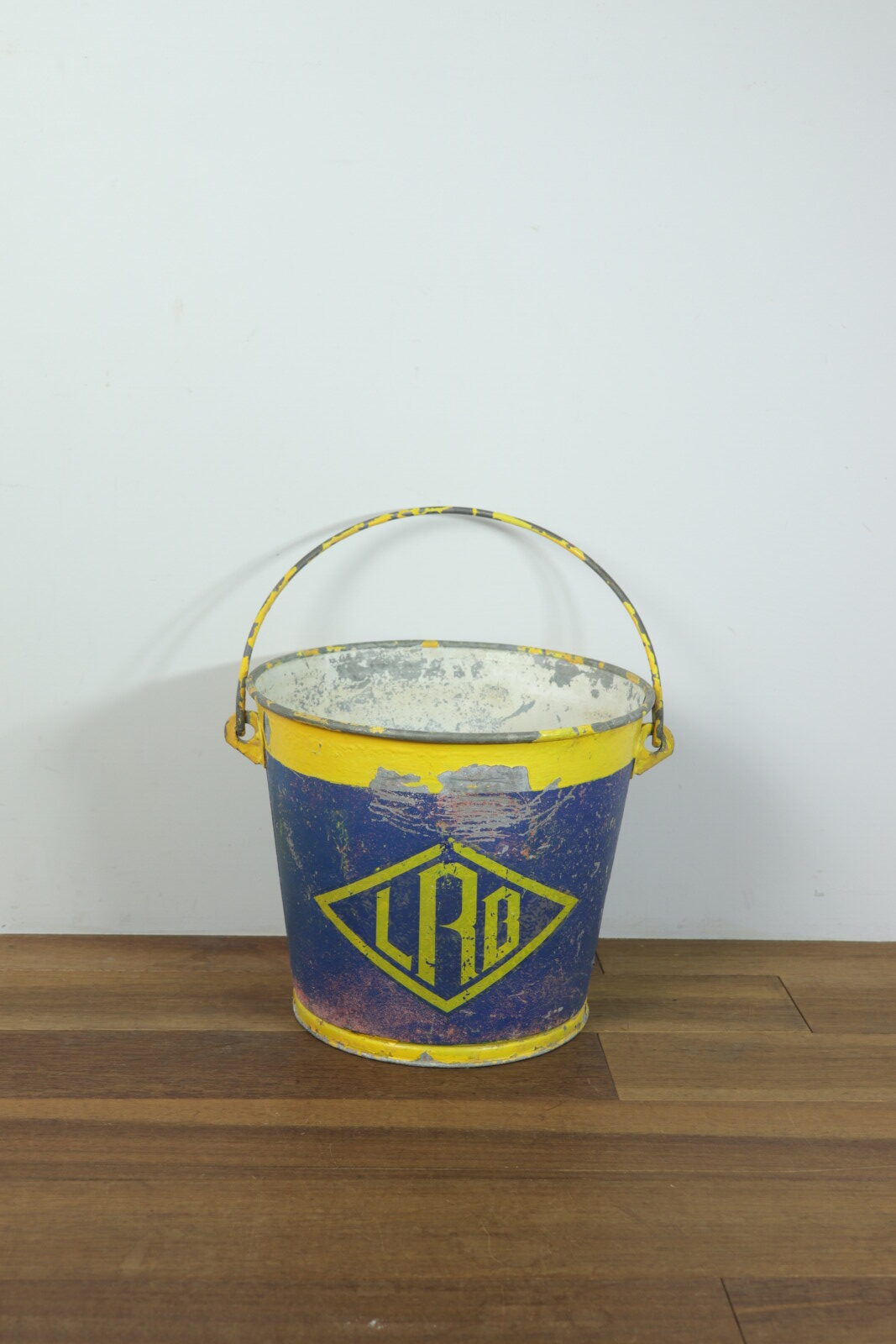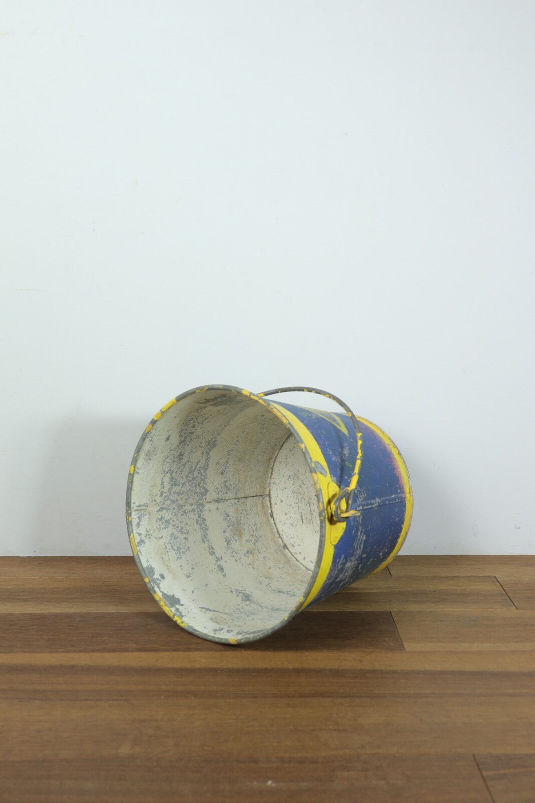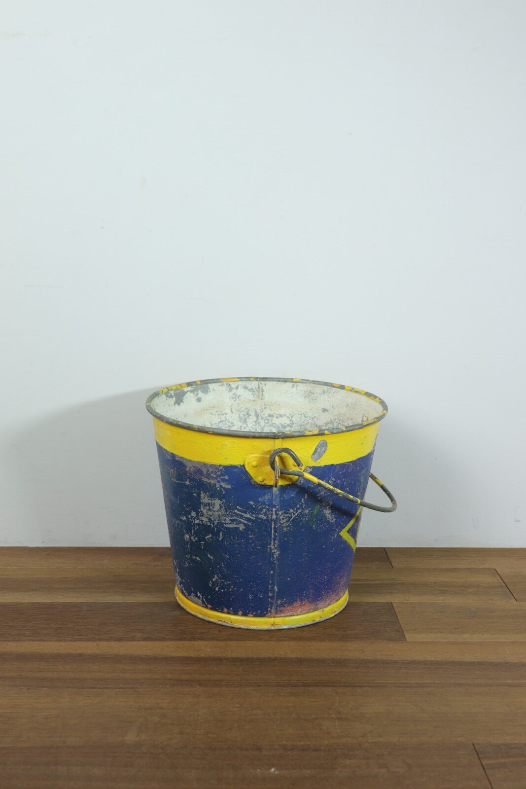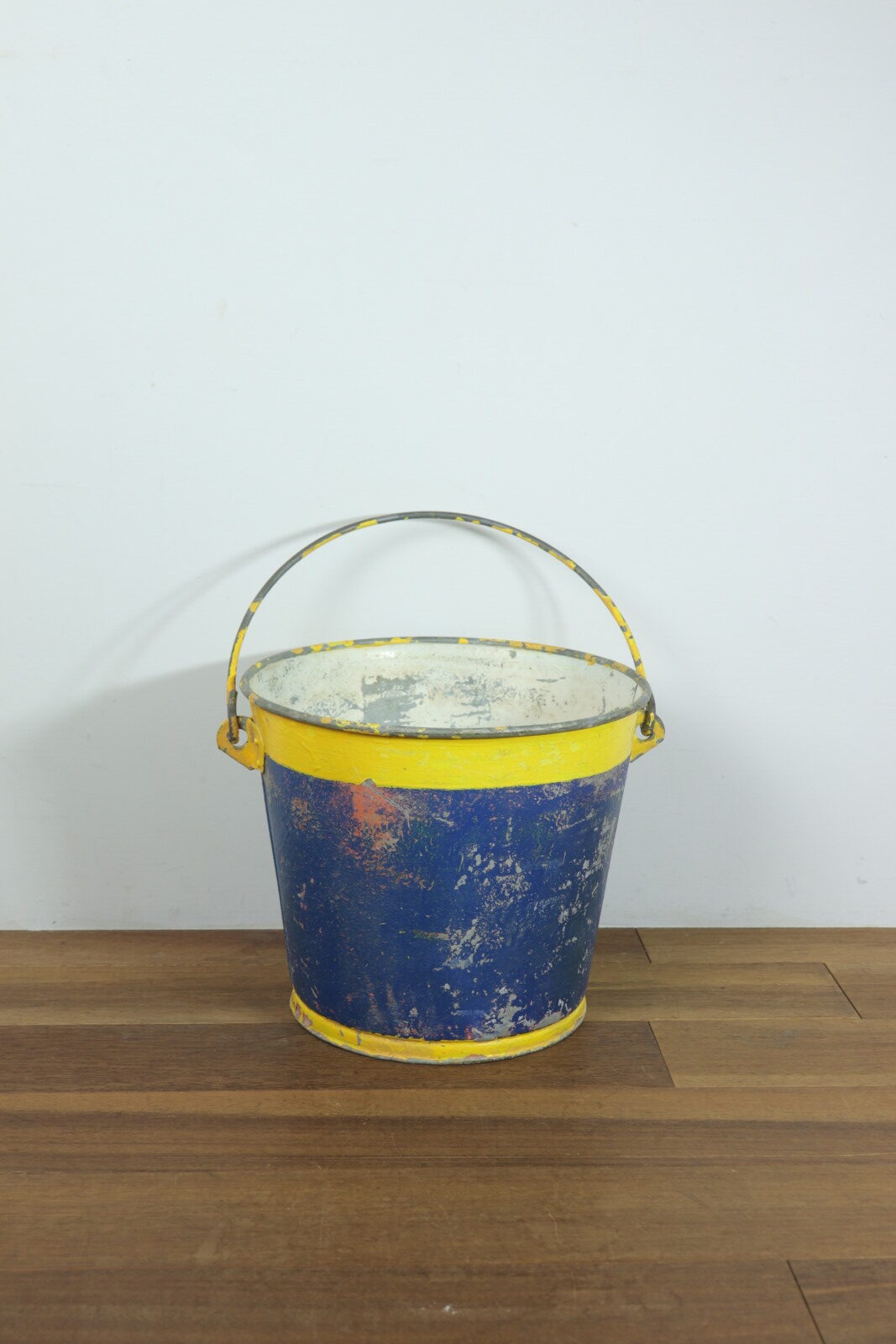 アメリカで購入した色鮮やかなメタル(鉄製)のバケツです。正確な年代は不明ですが1900年代初頭のモノだそうです。元々は馬のエサ入れとして厩舎で使われていたそうです。売主はその厩舎を運営していた方でした。そこを閉めることに事になり長年使ってきたモノを手放す中にこのバケツがありました。ペンキの剥げ具合と遠くからもパッとわかる黄色とブルーの色使いがステキで購入しました。見た目の明るさと比べて鉄の重みがあり実際に持つと重たいです。ハンドルの付き方や底の感じには今にはない重厚さがあり、歴史を感じさせてくれるバケツです。