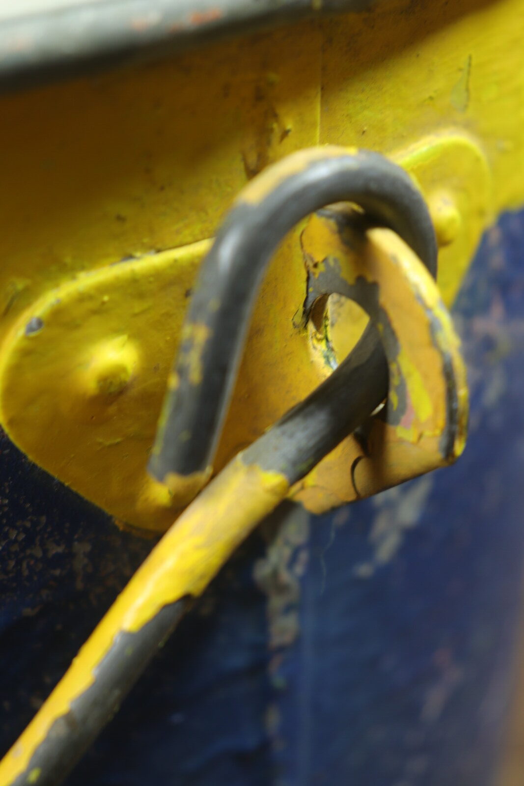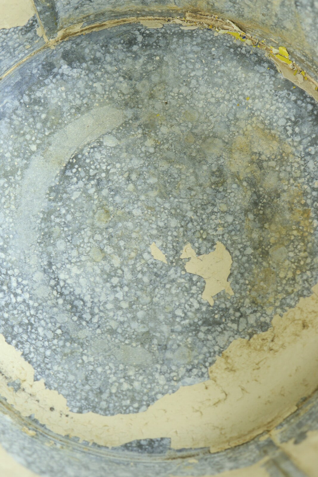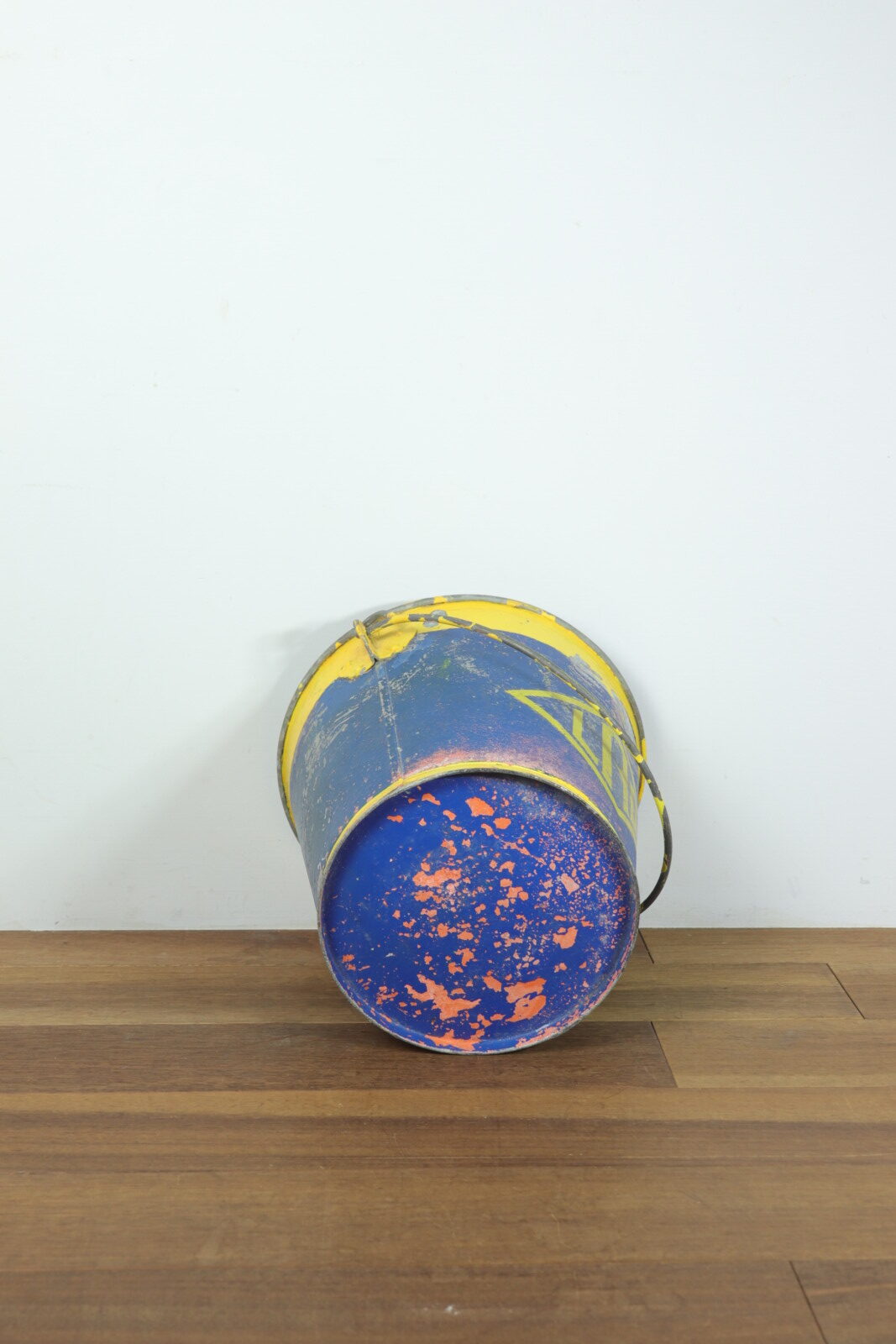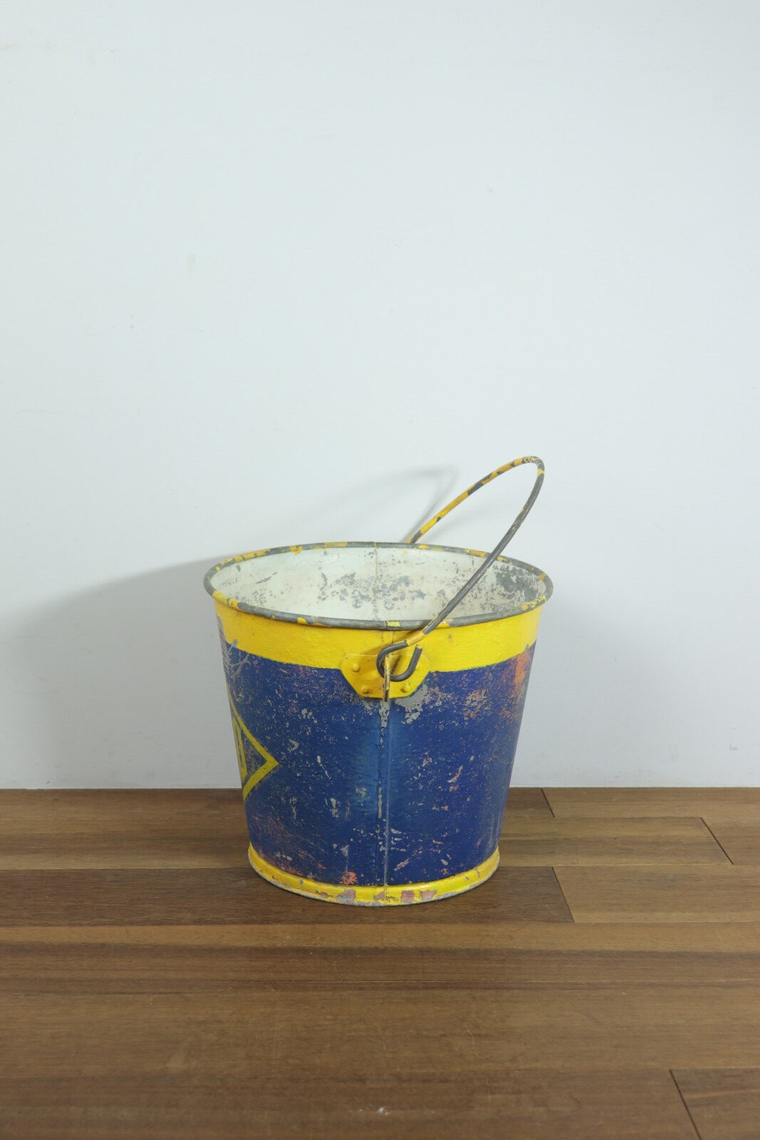 アメリカで購入した色鮮やかなメタル(鉄製)のバケツです。正確な年代は不明ですが1900年代初頭のモノだそうです。元々は馬のエサ入れとして厩舎で使われていたそうです。売主はその厩舎を運営していた方でした。そこを閉めることに事になり長年使ってきたモノを手放す中にこのバケツがありました。ペンキの剥げ具合と遠くからもパッとわかる黄色とブルーの色使いがステキで購入しました。見た目の明るさと比べて鉄の重みがあり実際に持つと重たいです。ハンドルの付き方や底の感じには今にはない重厚さがあり、歴史を感じさせてくれるバケツです。