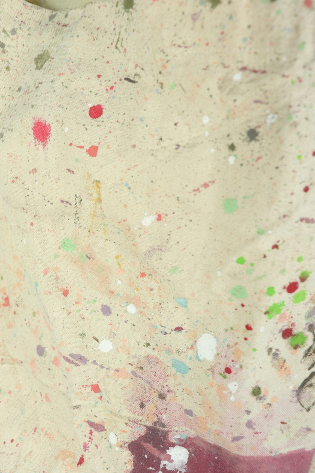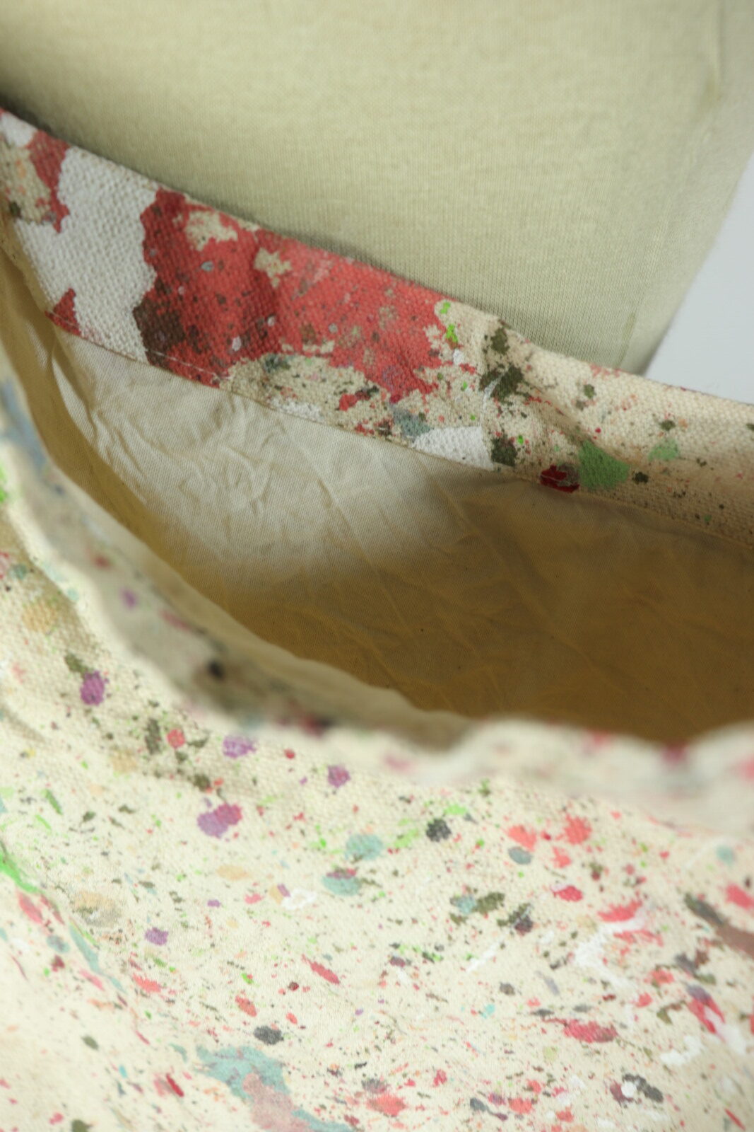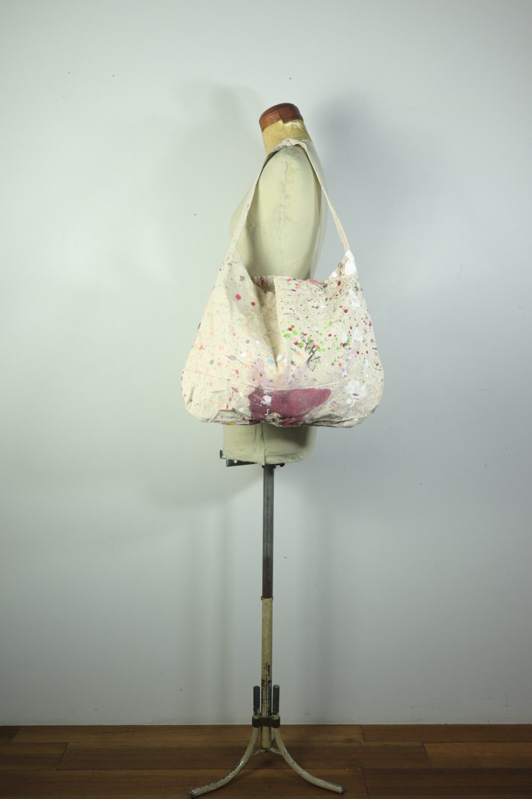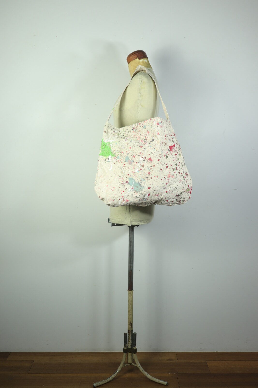 アメリカで購入したペンキが付いた生地で作ったショルダーバッグのMサイズの定番型です。ペンキを使うときに下に敷いていたのか?何かで使うために作ったのか?は不明です。明るい色のペンキばかりがイイ感じに飛んでいます。ペンキなのでポロッと取れたりすることもありますが洗っても落ちないのが良い点です。色々なバッグと一緒にパンパンにして持つのがカッコ良いです!…と思います。