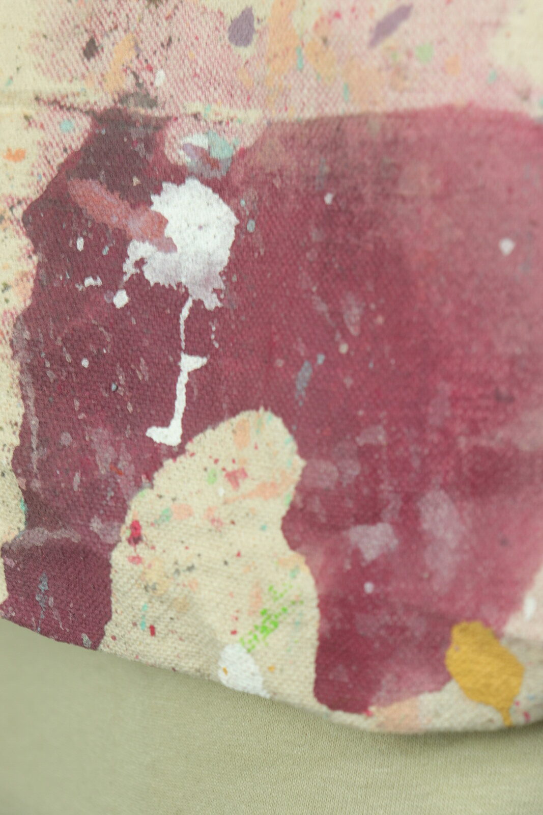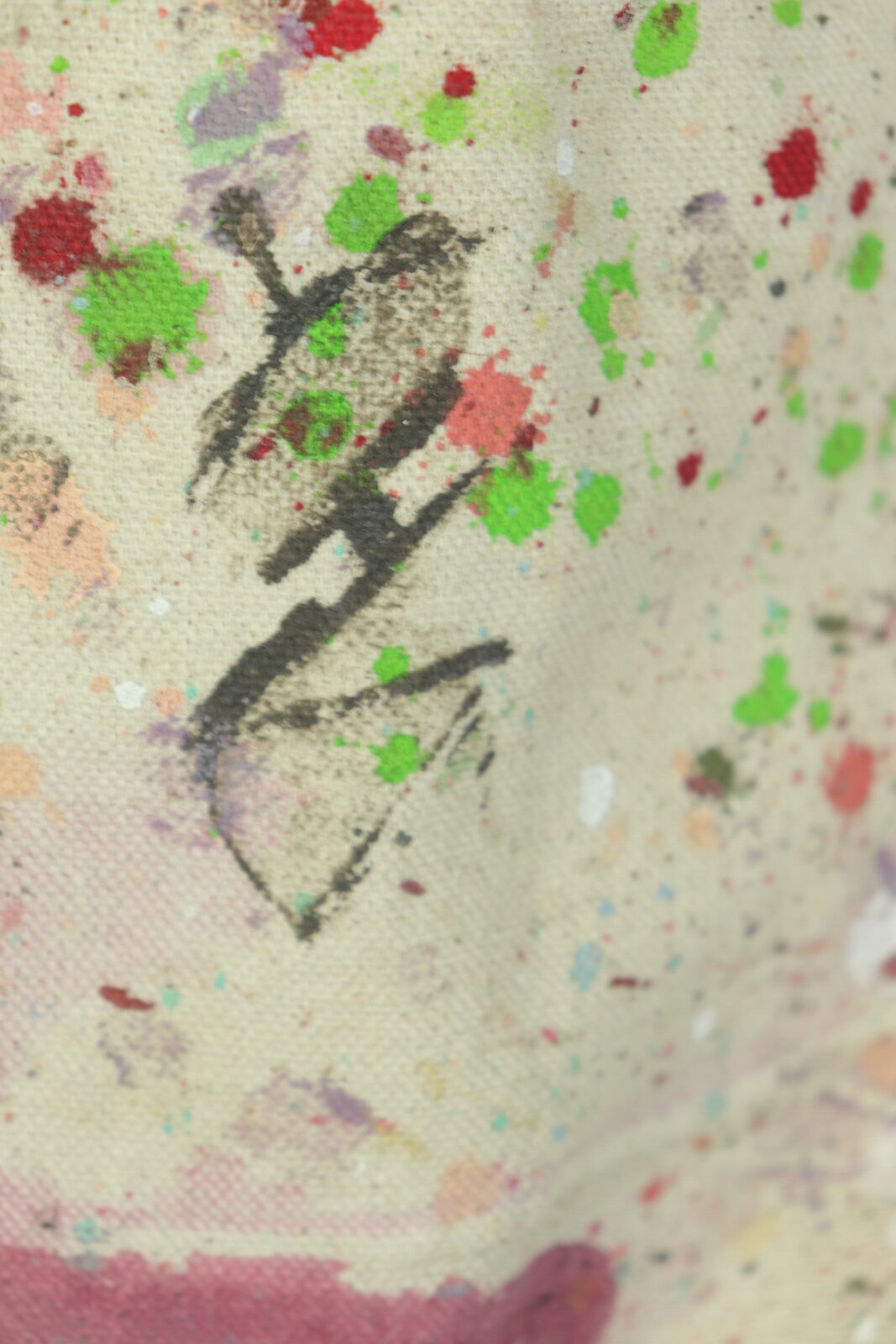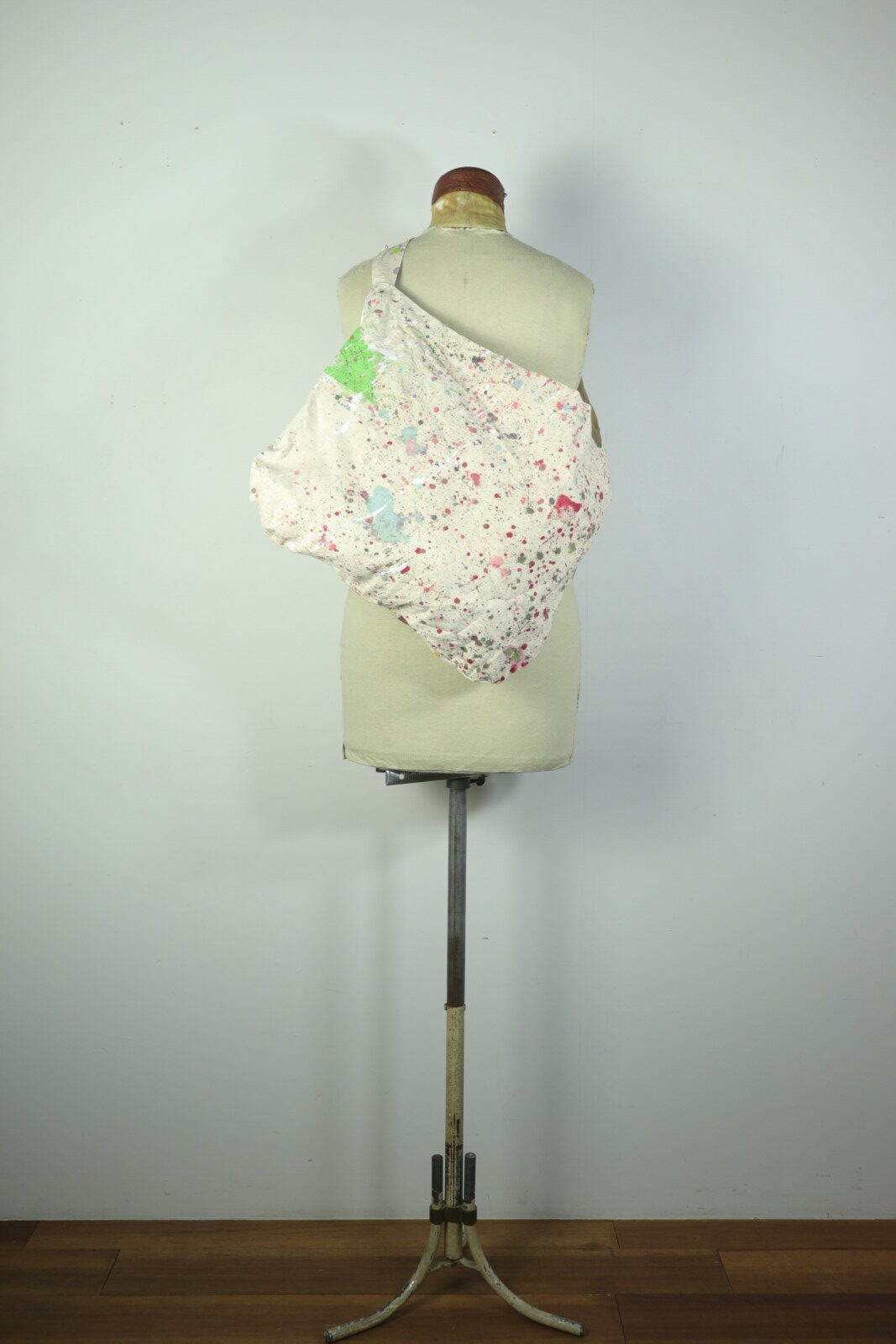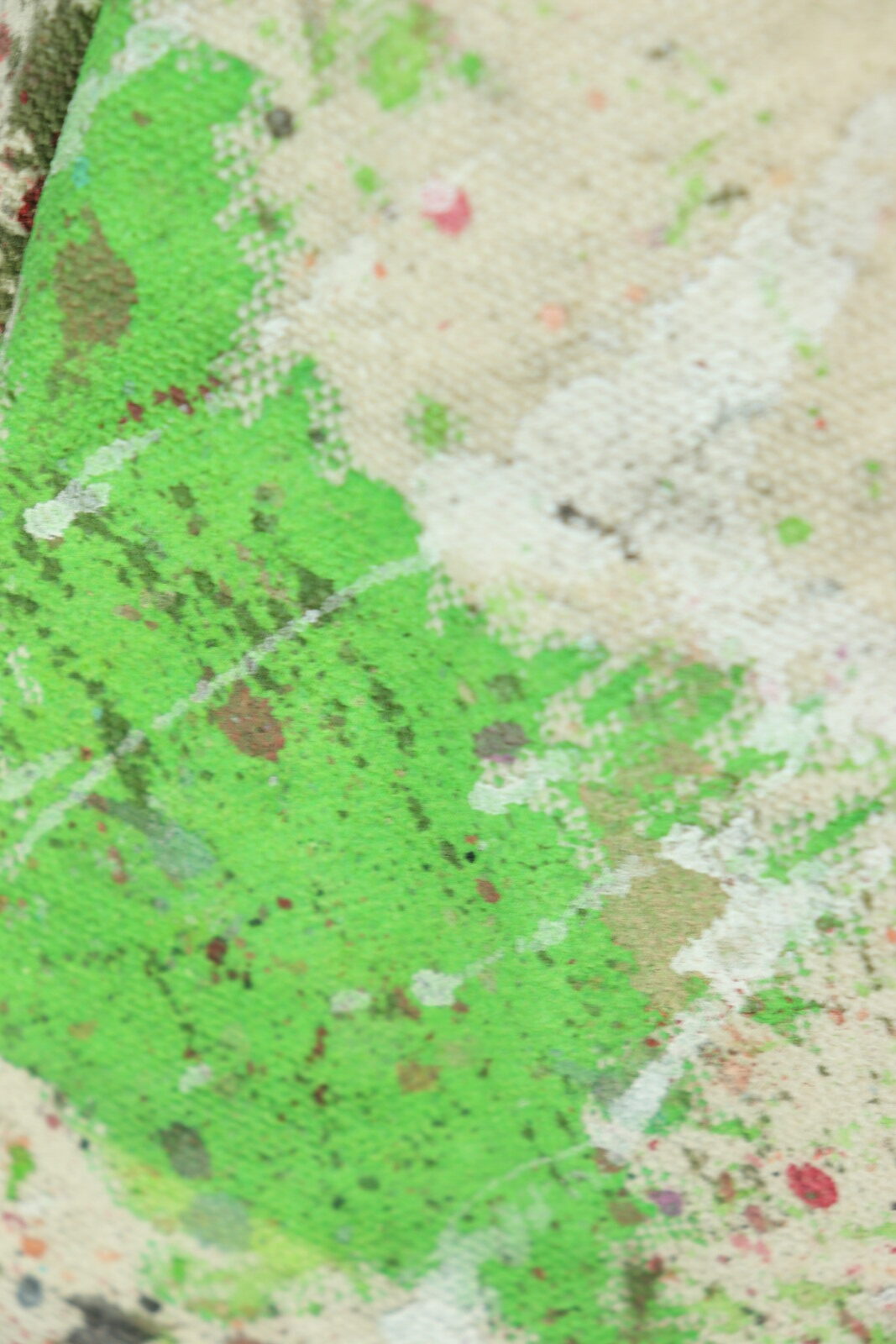 アメリカで購入したペンキが付いた生地で作ったショルダーバッグのMサイズの定番型です。ペンキを使うときに下に敷いていたのか?何かで使うために作ったのか?は不明です。明るい色のペンキばかりがイイ感じに飛んでいます。ペンキなのでポロッと取れたりすることもありますが洗っても落ちないのが良い点です。色々なバッグと一緒にパンパンにして持つのがカッコ良いです!…と思います。