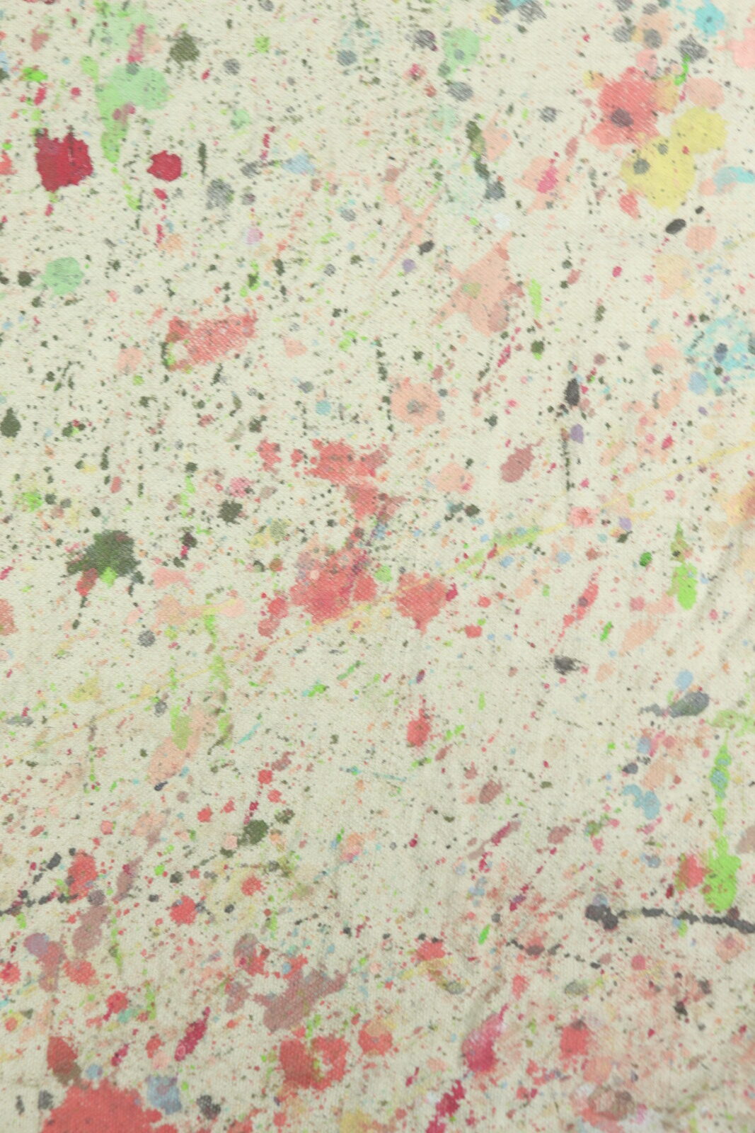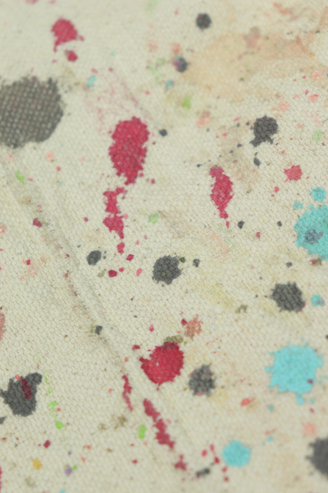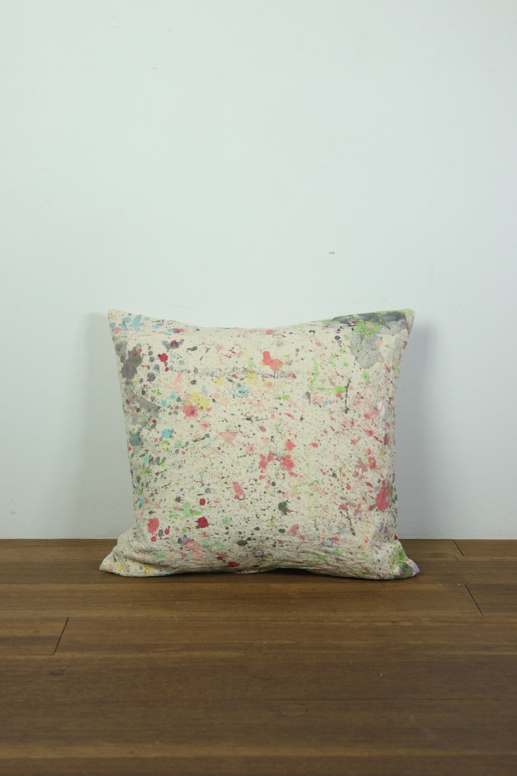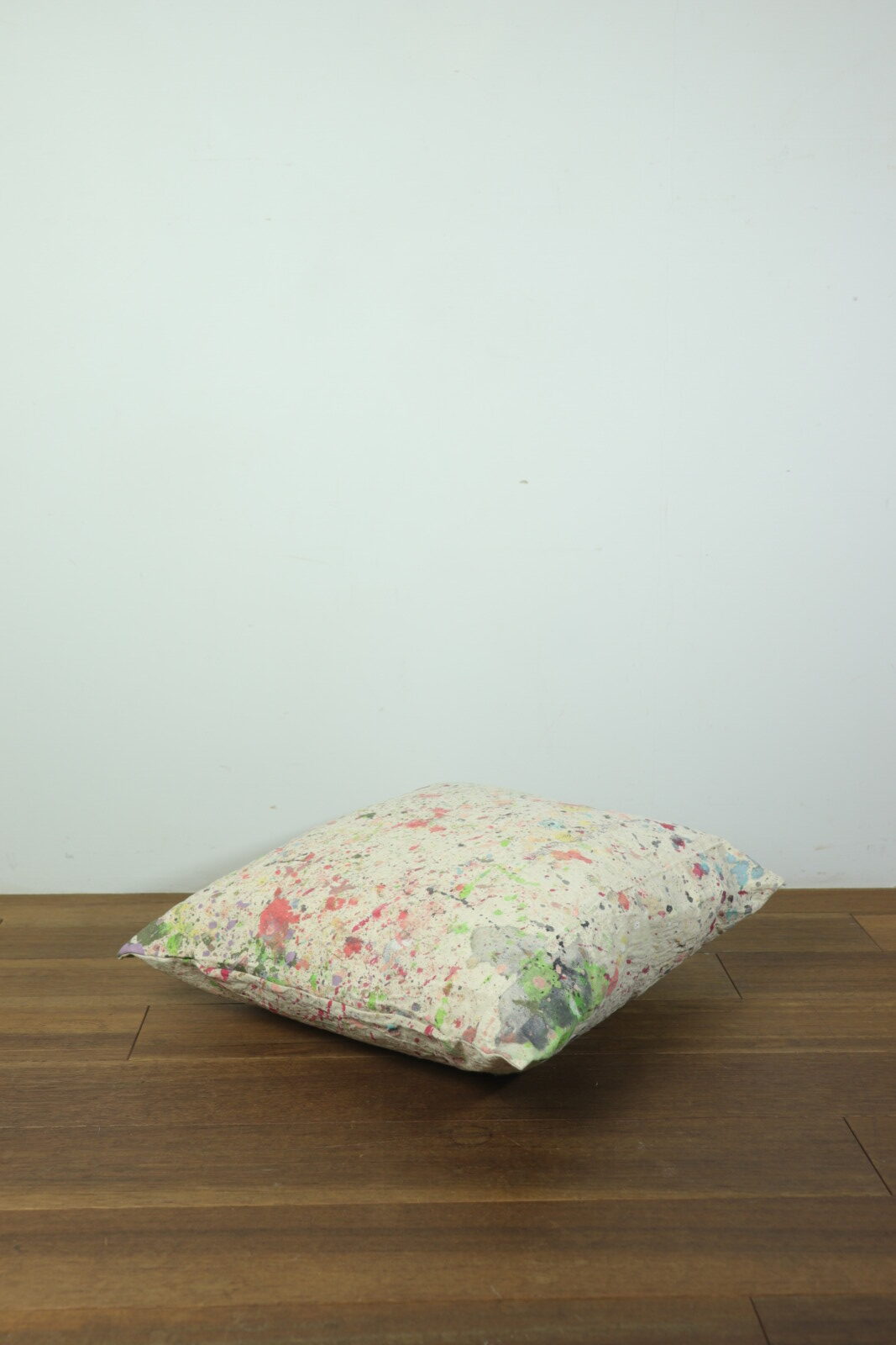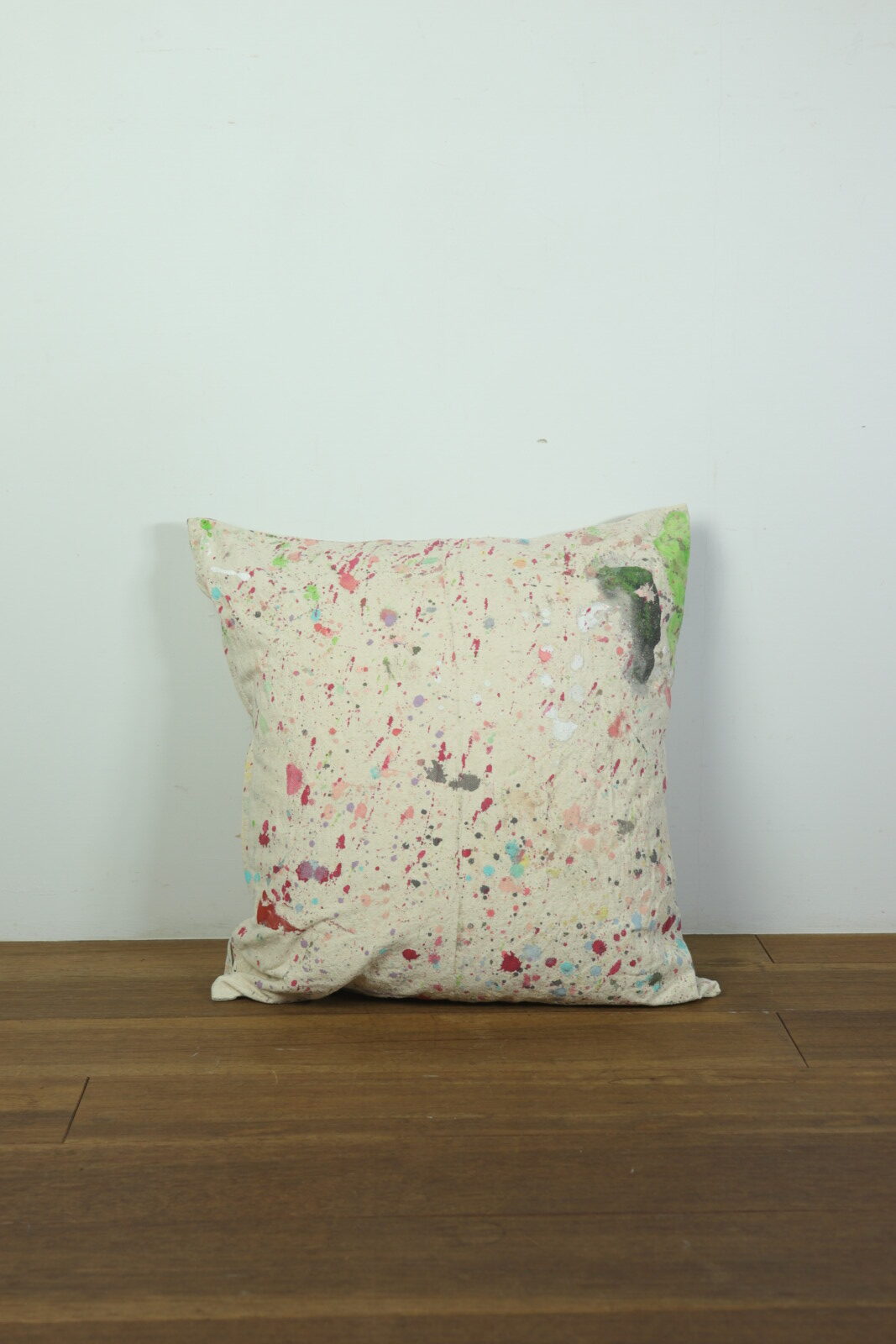 アメリカで購入したペンキが付いた生地で作ったクッションです。インナークッションは現行の羽根100%のモノです。生地はペンキを使うときに下に敷いていたのか?何かで使うために作ったのか?は不明です。明るい色のペンキばかりがイイ感じに飛んでいます。ペンキなので洗っても落ちないのも良い点です。