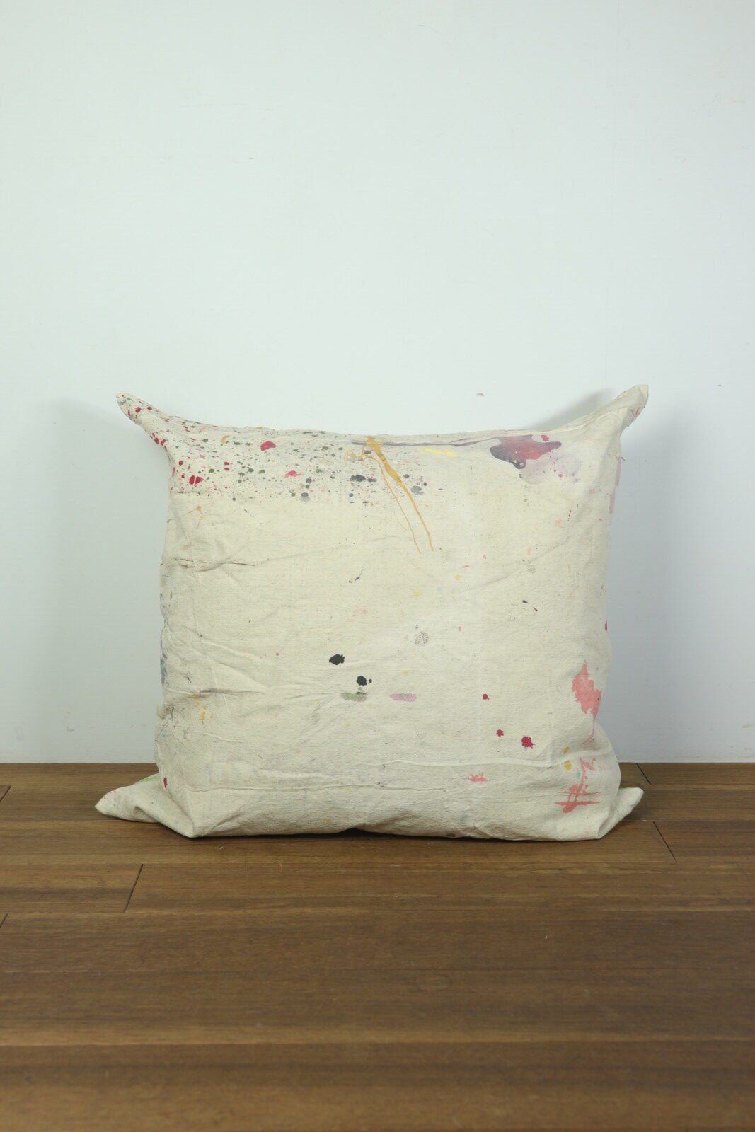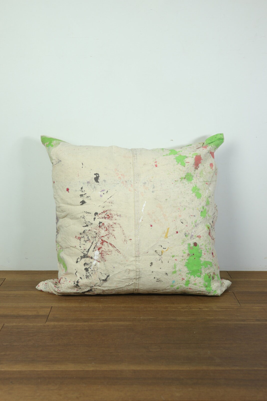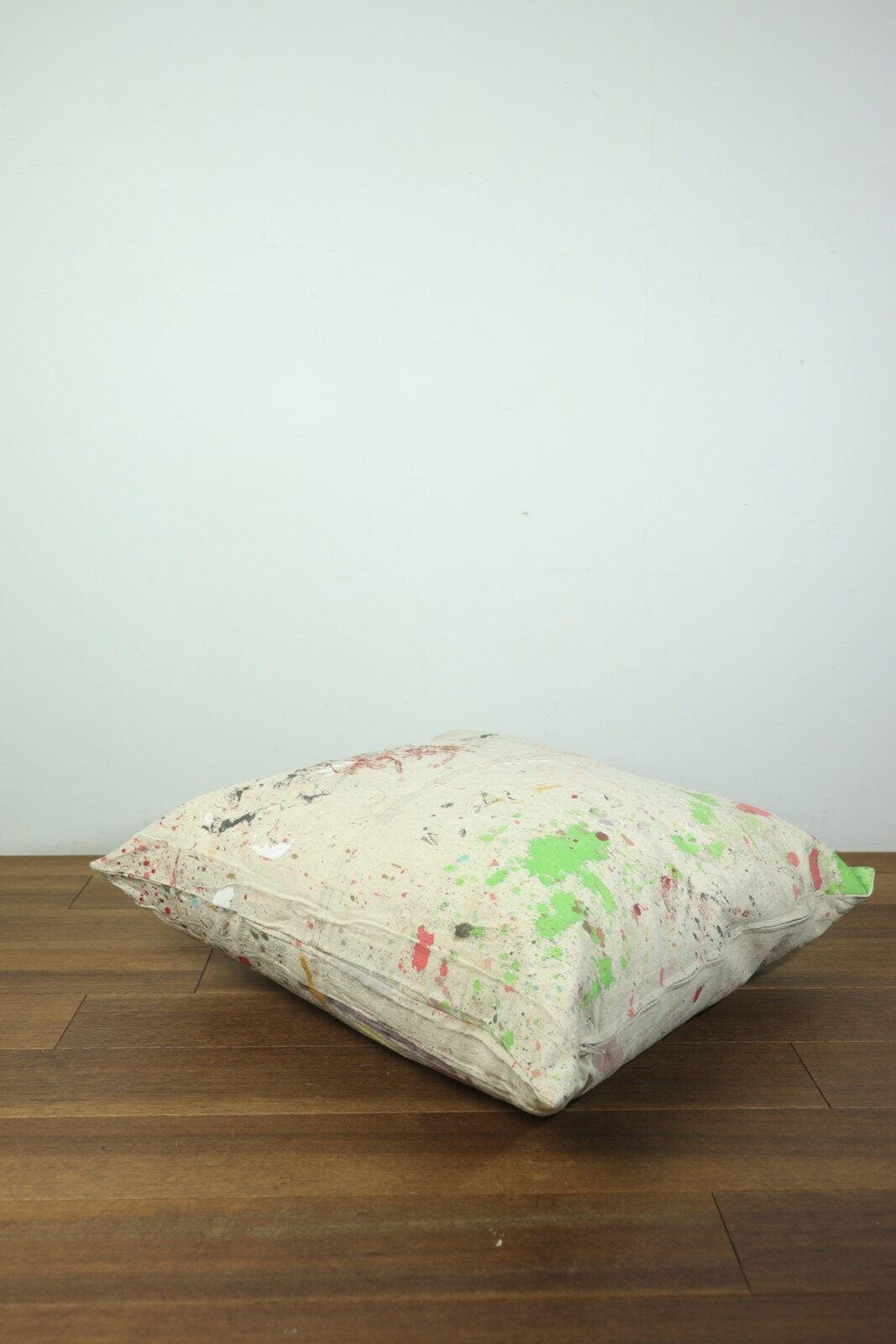 アメリカで購入したペンキが付いた生地で作った大きなサイズのクッションです。インナークッションは現行の羽根100%のモノです。生地はペンキを使うときに下に敷いていたのか?何かで使うために作ったのか?は不明です。明るい色のペンキばかりがイイ感じに飛んでいます。ペンキなので洗っても落ちないのも良い点です。座布団代わりに使うのもおススメです