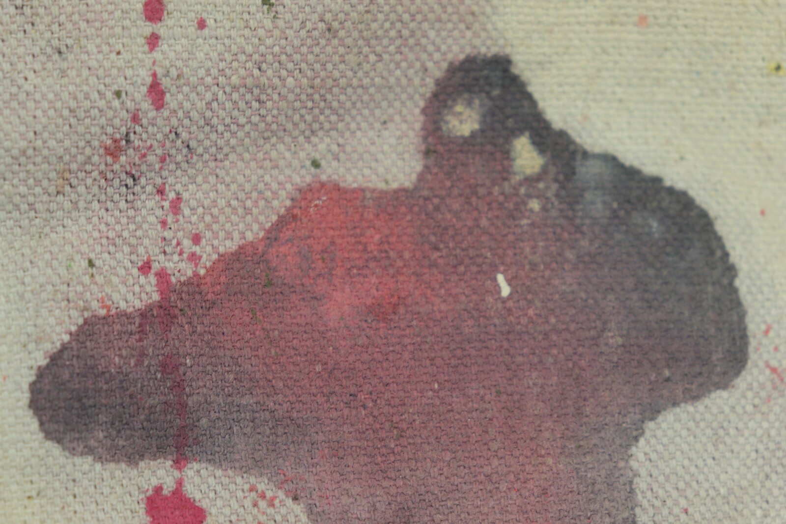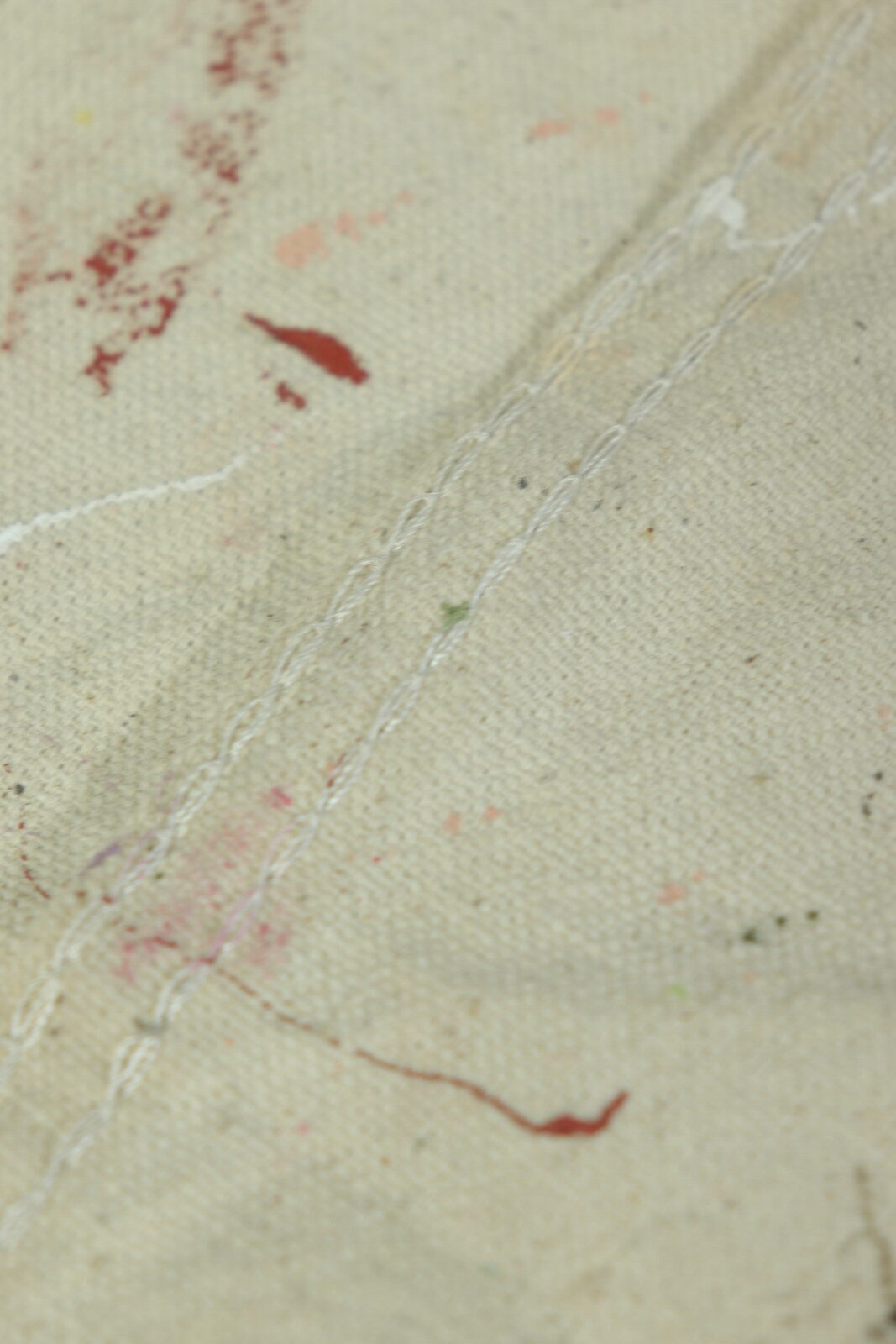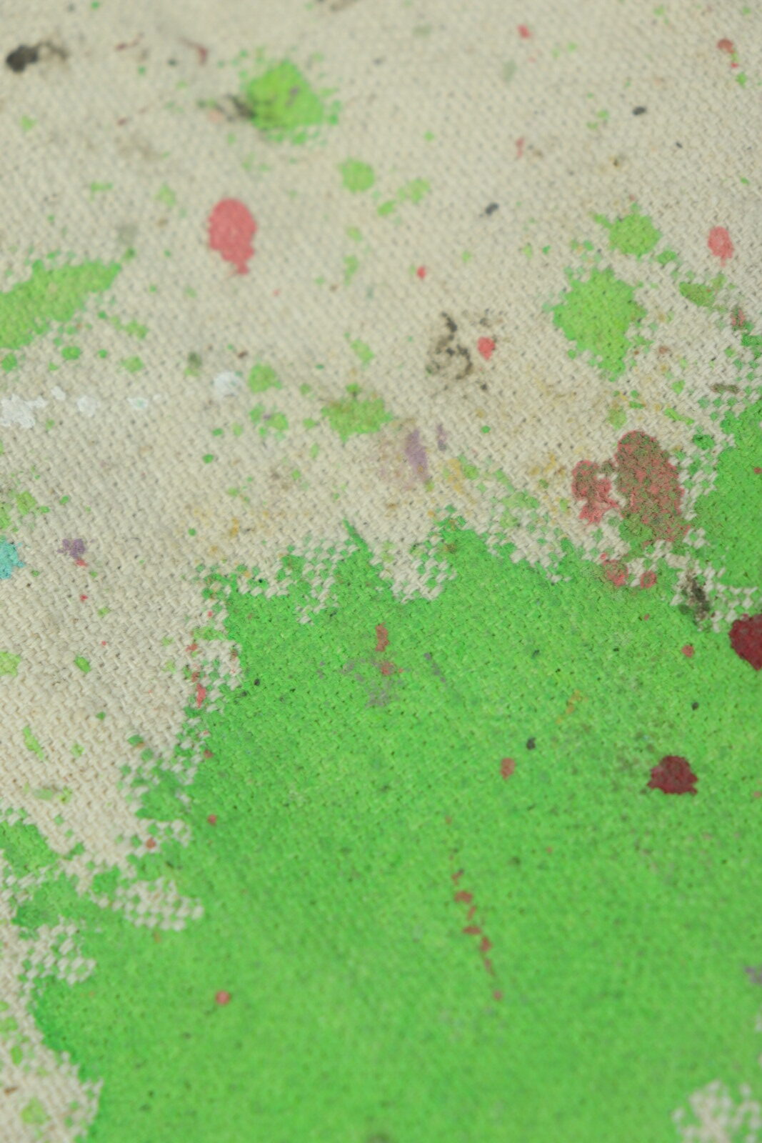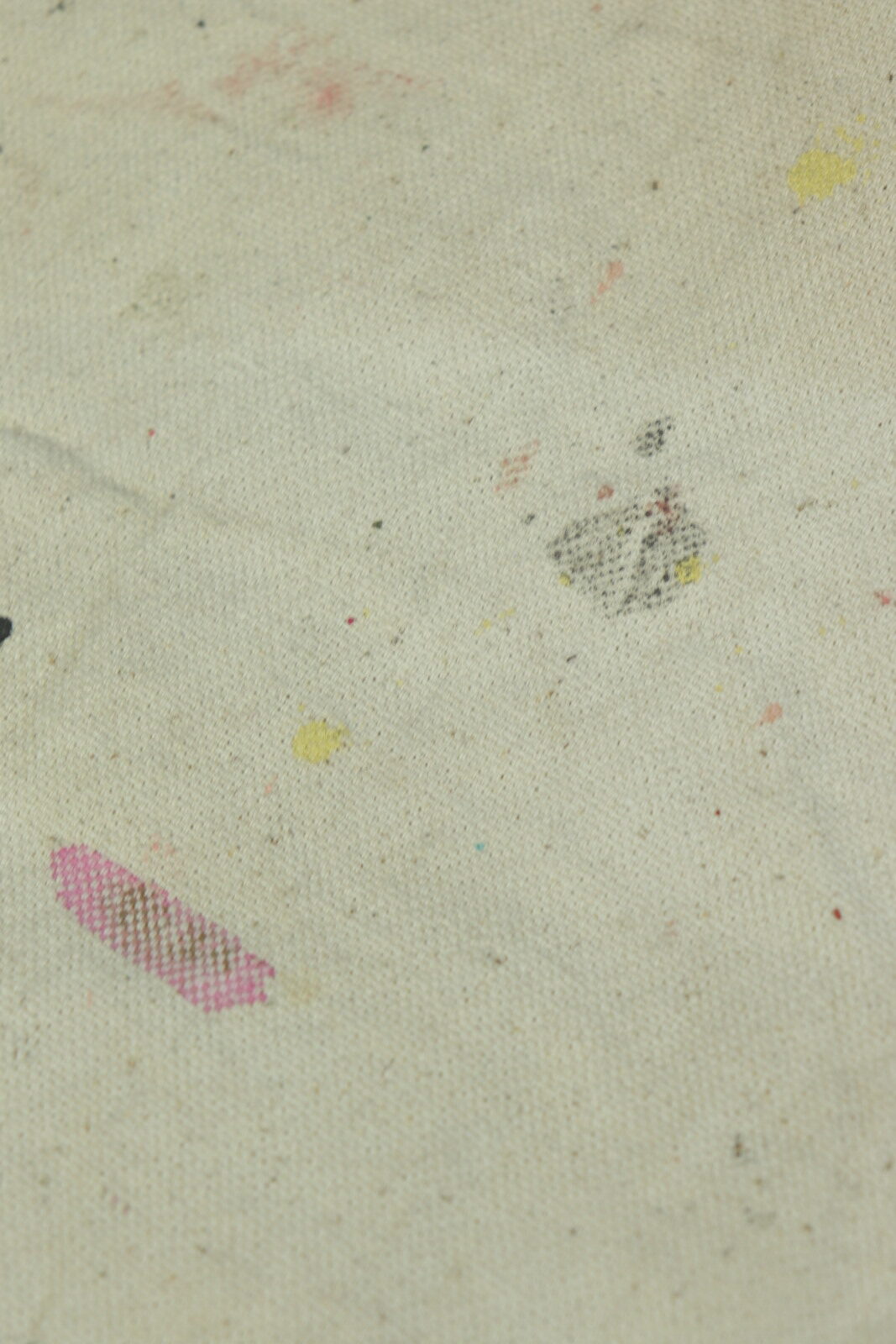 アメリカで購入したペンキが付いた生地で作った大きなサイズのクッションです。インナークッションは現行の羽根100%のモノです。生地はペンキを使うときに下に敷いていたのか?何かで使うために作ったのか?は不明です。明るい色のペンキばかりがイイ感じに飛んでいます。ペンキなので洗っても落ちないのも良い点です。座布団代わりに使うのもおススメです