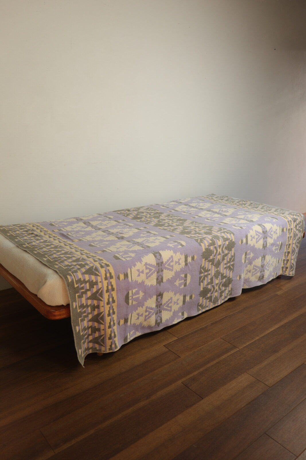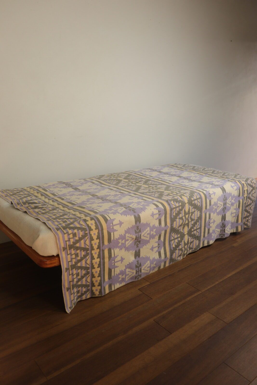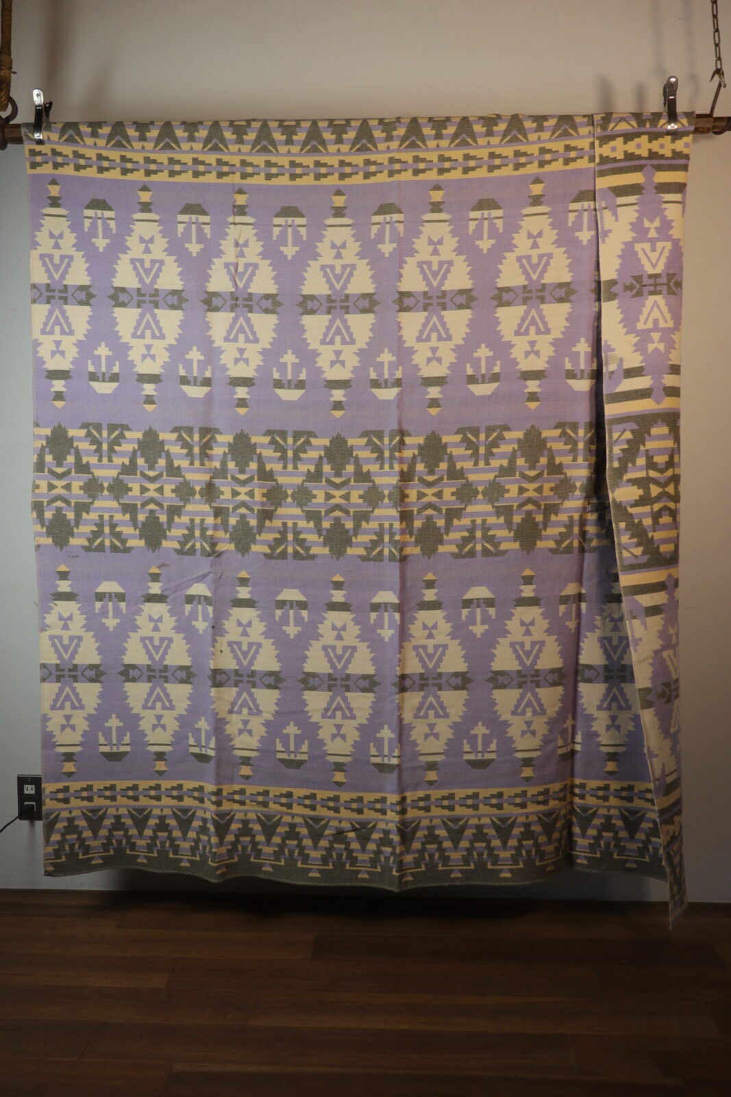 ビンテージのキャンプブランケットです。タグが無いので年代やブランドは不明ですがビーコンブランケットっぽいです。元はもう少し大きなサイズでしたが、端にダメージがあったのでその部分をカットしてステッチをかける補修を国内でした為、オリジナルより少し小さくなっています。キャンプブランケットの良いところは速乾性です。色、柄ともに良い感じです。